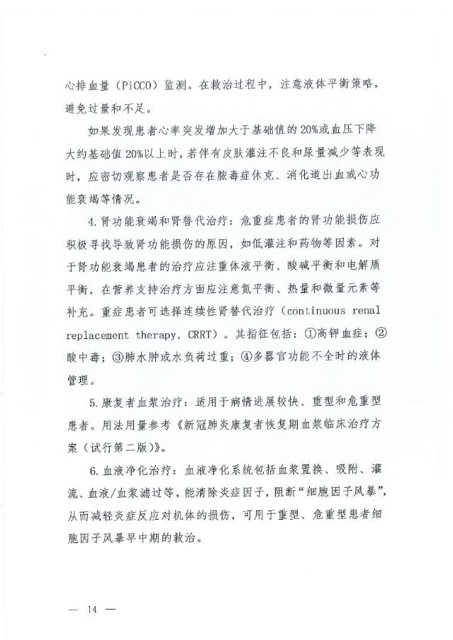 在重型、危重型病例治疗方面,方案明确了血液净化治疗。血液净化系统包括血浆置换、吸附、灌流、血液/血浆滤过等,能清除炎症因子,阻断“细胞因子风暴”,从而减轻炎症反应对肌体的损伤,可用于重型、危重型患者细胞因子风暴早中期的救治。