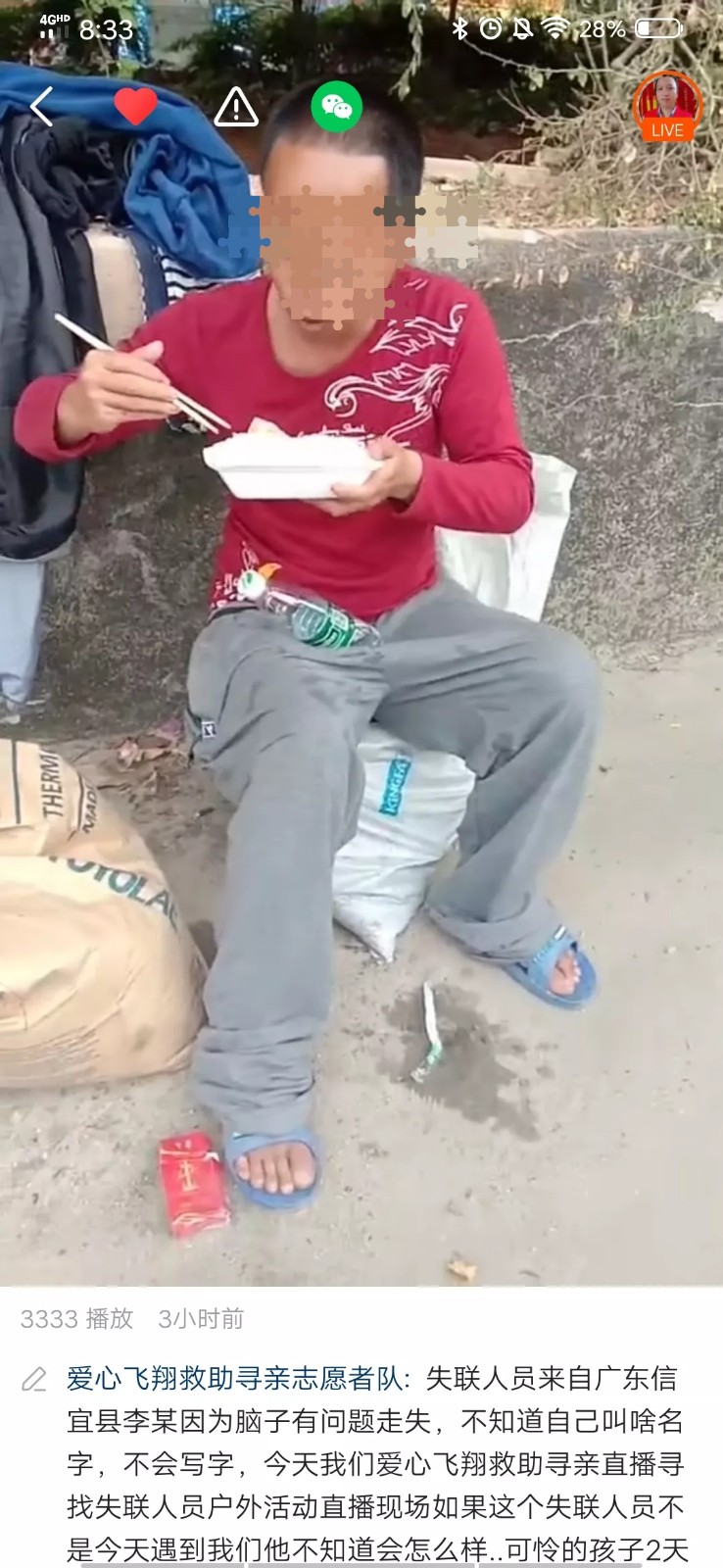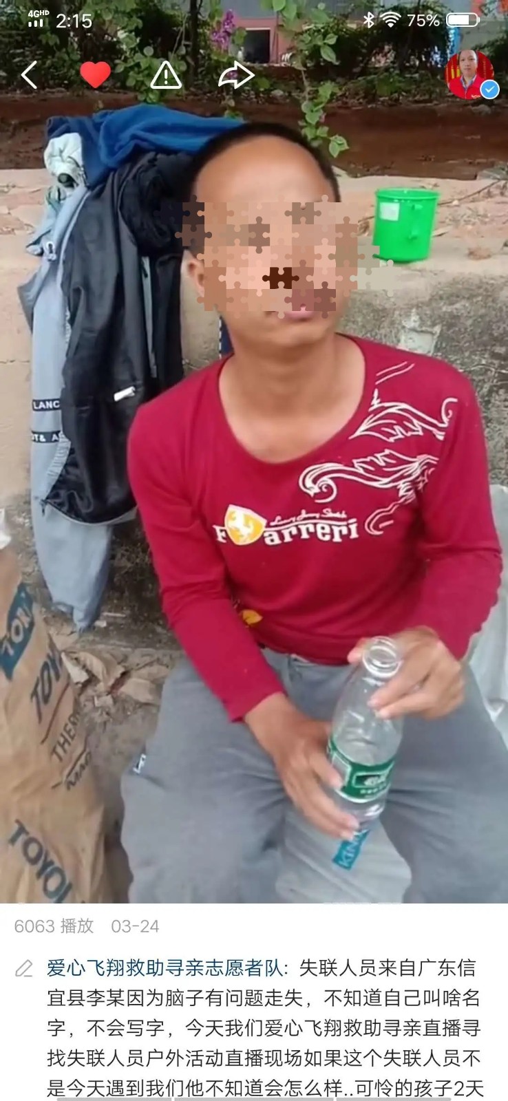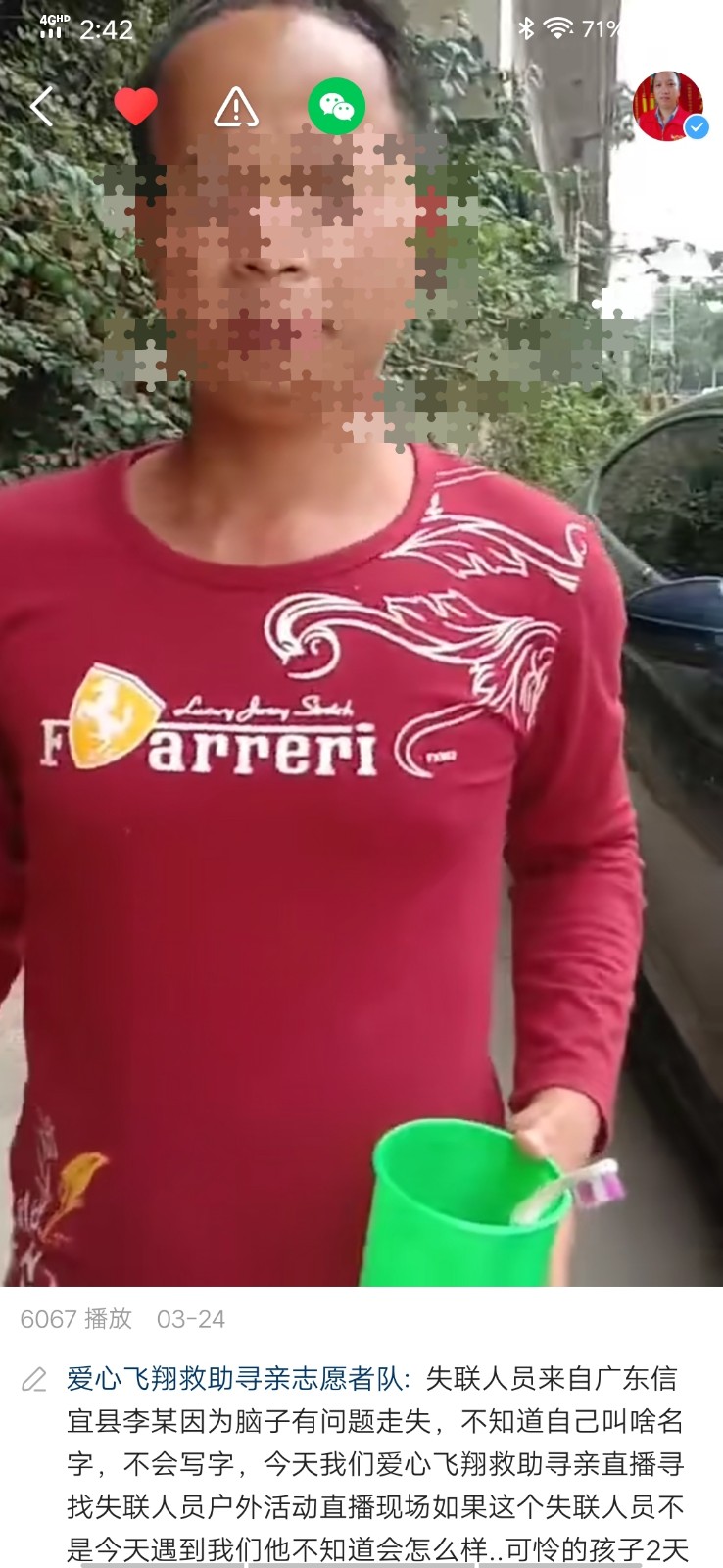 3月24日中午12时,“爱心飞翔救助寻亲志愿队”(快手ID:AA429281704)像往常一样进行寻亲户外直播时,在东莞一处高速桥边发现一名走失者。当时他穿着拖鞋坐在路边,随身只带了水杯、牙膏和几件衣服。
