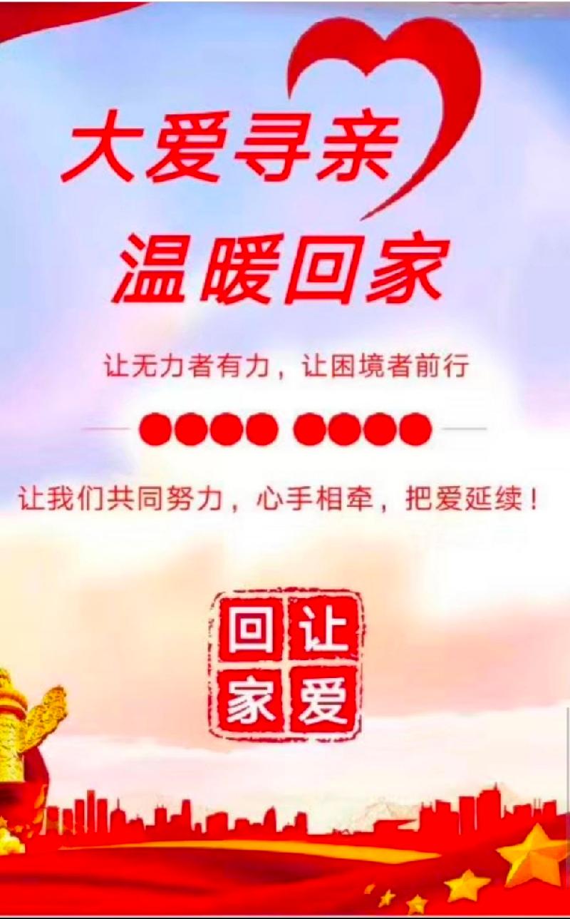 为缘寻找,为爱坚守!让爱回家,不抛弃,不放弃!愿人人付出爱,人人得到爱,人人传递爱!关爱弱势群体,共筑和谐社会!《让爱回家寻亲网》为帮助被拐失联失踪人员寻家以及家人寻找被拐失联失踪人员提供了一个平台,充分利用互联网的优势,帮助更多失散的家庭团圆!