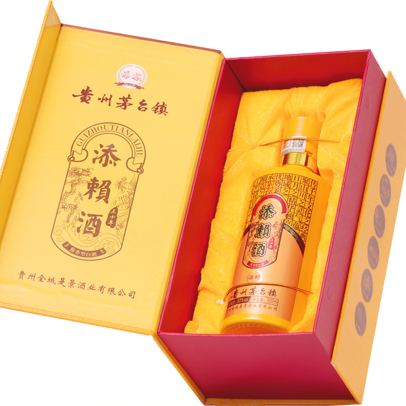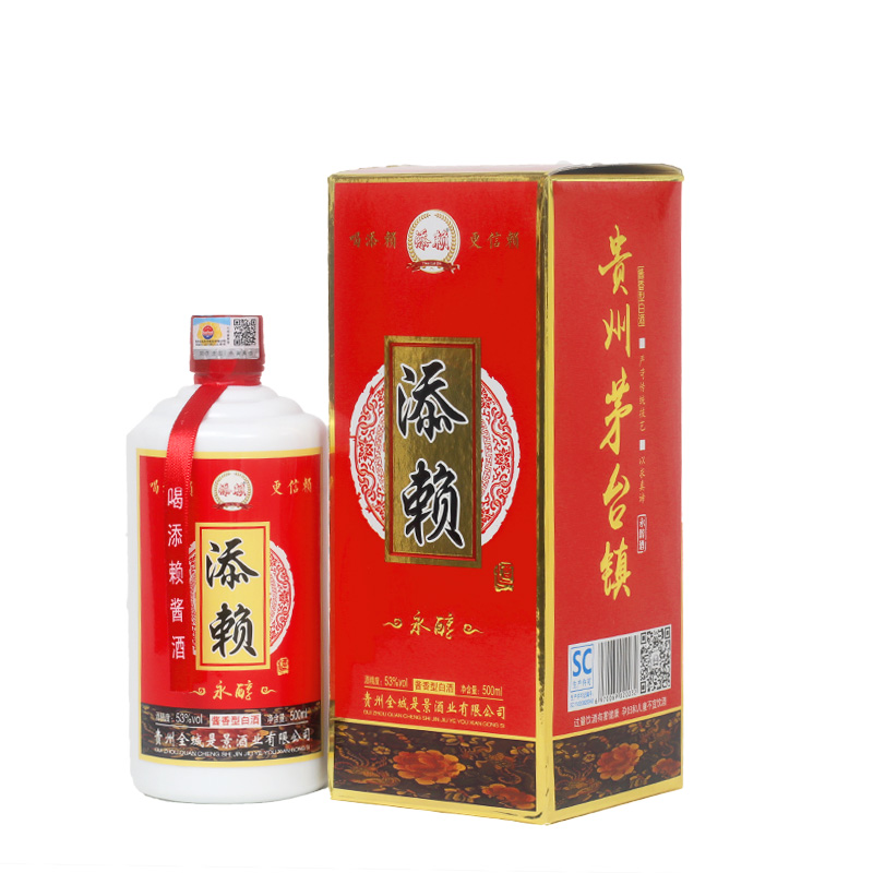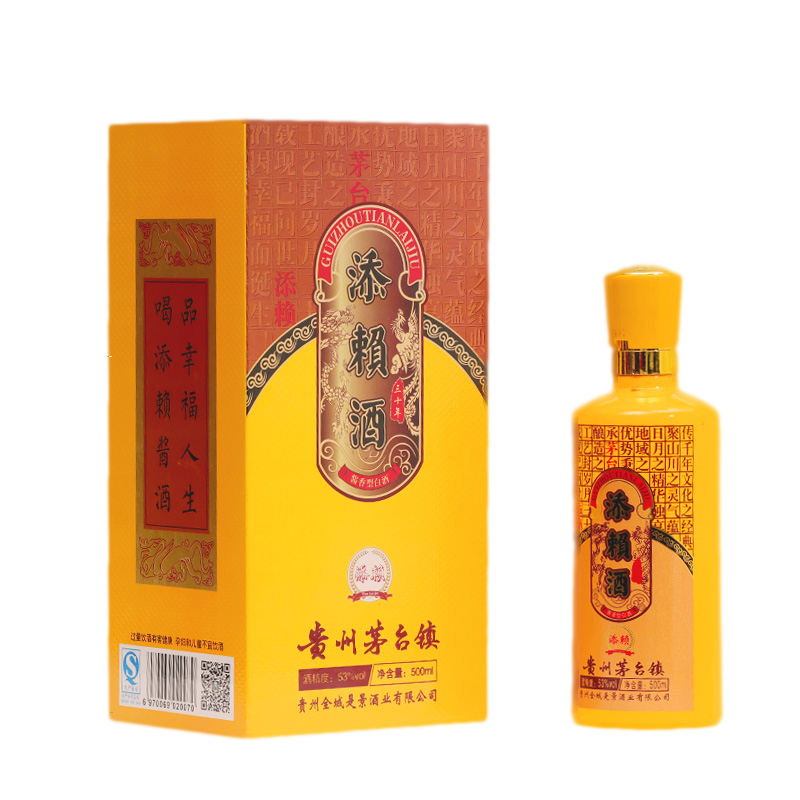 【添赖三十年】:是源自茅台镇,酱香型53度年份酒,它的诞生源于选择优质高粱为原料,依靠茅台得天独厚的自然资源,采用科学的独特的传统工艺,经过精心酝酿与时间的考验,具有酱香味突出,优雅细腻,酒体醇厚,回味持久,空杯留香等特点。添赖30年使用高档礼盒包装,外观颜色凸显流金岁月,酒瓶使用烤花瓶,极具艺术性,外观高上档次;尽显奢华,是馈赠宴请的佳品。喝天赖,更信赖!
