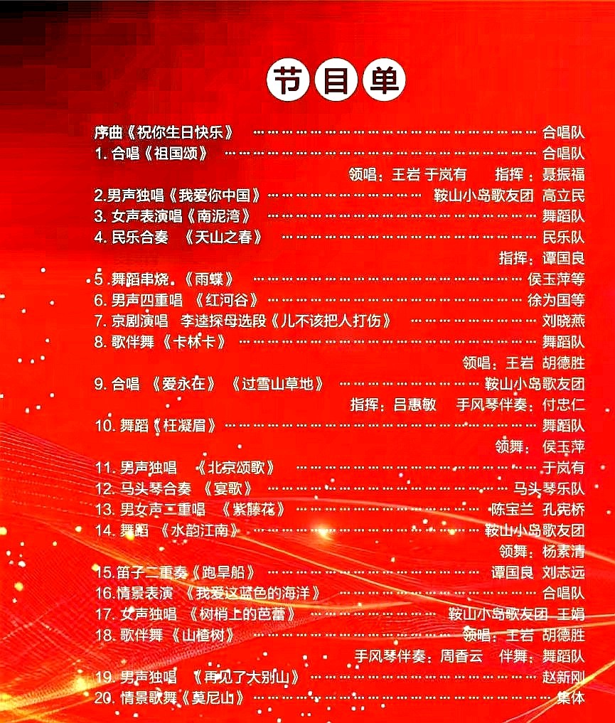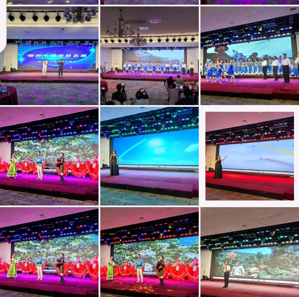 在三个多小时的演出中,先后以非常专业化敬业认真艺彩飞扬地演出了合唱歌曲《祝你生日快乐》《祖国颂》,男声独唱《我爱你中国》,女声表演唱《南泥湾》民乐合奏《天山之春》舞蹈串烧,《雨蝶》男声四重唱《红河谷谷》京剧演唱李逵探母选段《儿不该把人打伤》舞蹈《枉凝眉》等二十多个曲目视听盛宴的精彩演出,呈现出大连蓝光艺术团逐梦之音,宛若天籁,起舞身影,羽裳飞天的风采和艺术高水准!