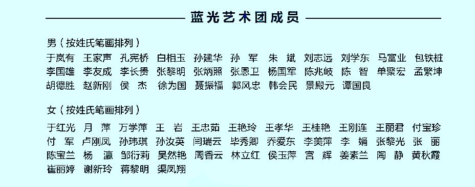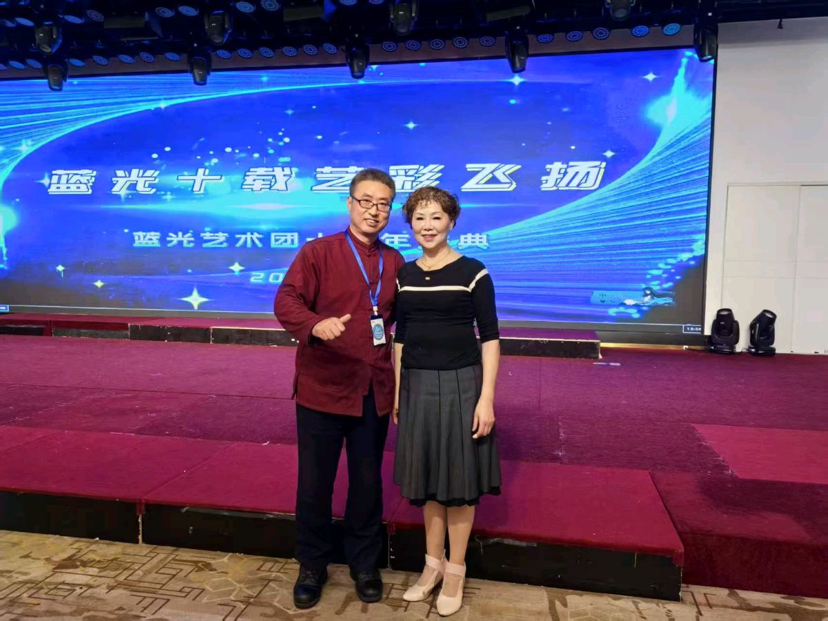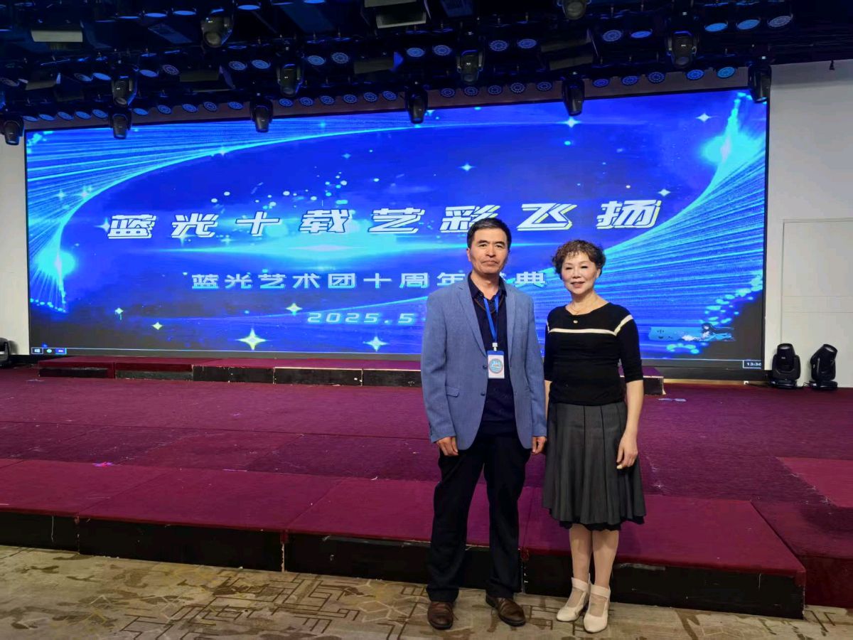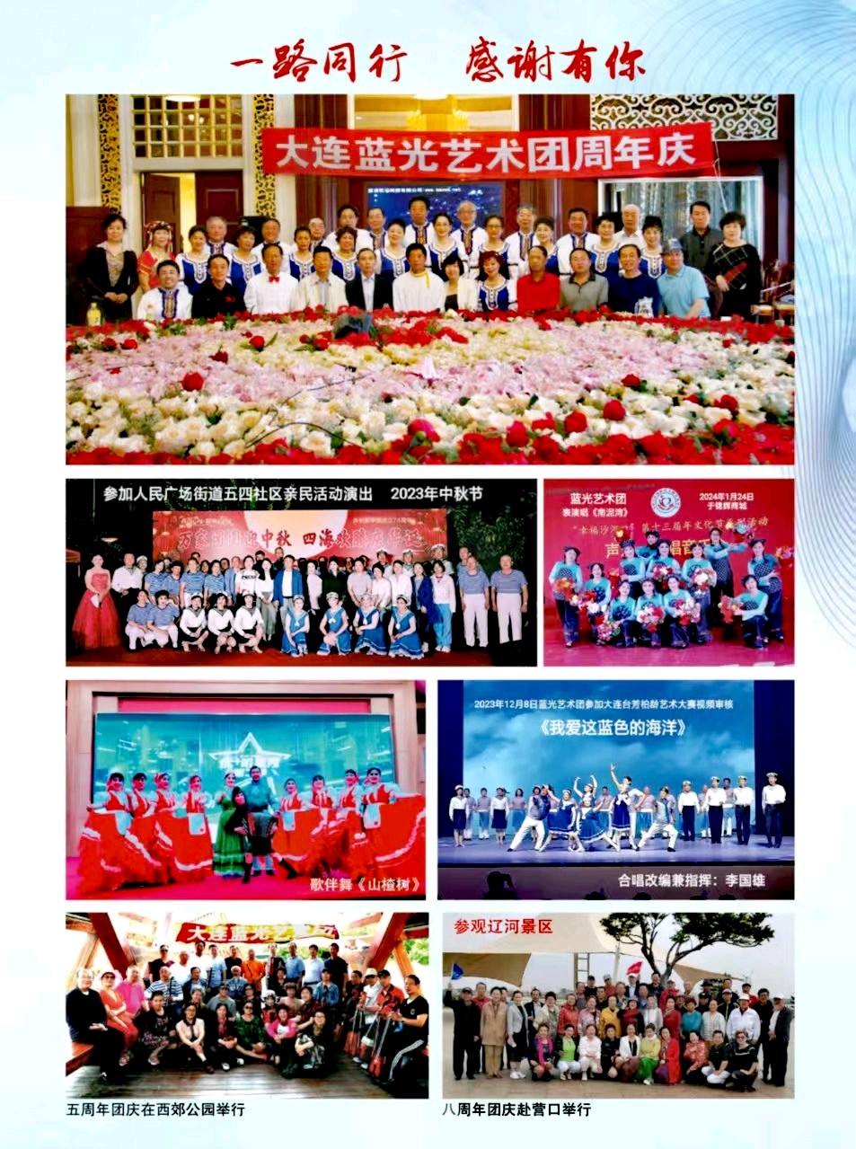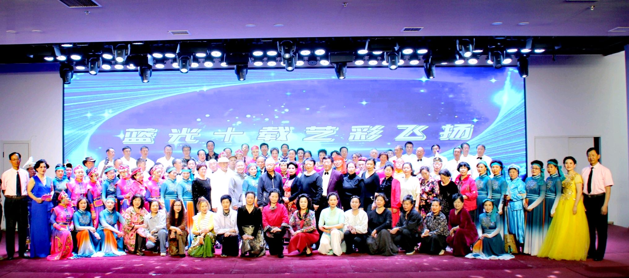 “十年风雨,十年秋华。今天,当舞台上的灯光再次为蓝光人点亮时,我们已经坚守蓝光艺术团三千多个昼夜了。在岁月的沉淀与艺术交相辉映的过程中,蓝光人已从青发到白发。我们不懈的坚持和努力,造就了蓝光人"老有所乐"的团魂。在蓝光团不断的发展和壮大的路上,我们不仅是艺术质量和人生质量的提高,也得到真挚的友谊和欢乐。为此,我们倍感荣幸和自豪!夕阳路上,让我们奋进共勉留住晚年的眷恋! 感谢所有支持和关爱蓝光艺术团的领导、同仁和朋友们! 祝蓝光艺术团十年庆典圆满成功!