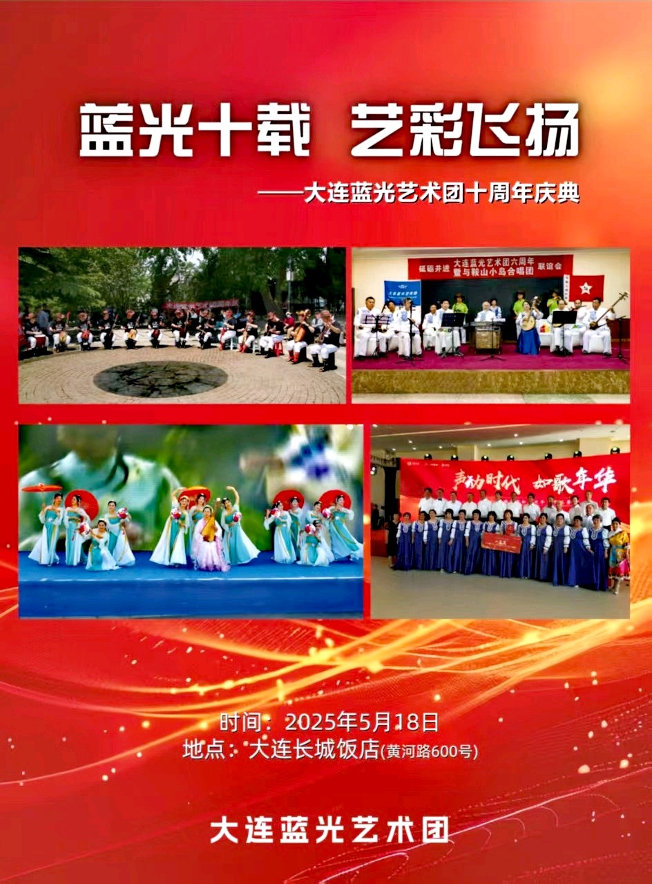 五月滨城,美丽浪漫时尚。2025年5月18日上午,蓝光十载,艺彩飞扬,大连蓝光艺术团十周年庆典活动,欢歌热舞器乐演奏中外数十个曲目精彩文艺演出在大连市黄河路长城饭店近百名团员与莅临领导和嘉宾及本次庆典活动友情助演的鞍山市小岛歌友团济济一堂,隆重举办。 本场庆典支持的单位有大连市人民广场街道五四社区、幸福人寿大连分公司,以及有为蓝光艺术团本场十年庆典赞助刘志远、孙建华、张黎明、文静、刘礼兴等个人。