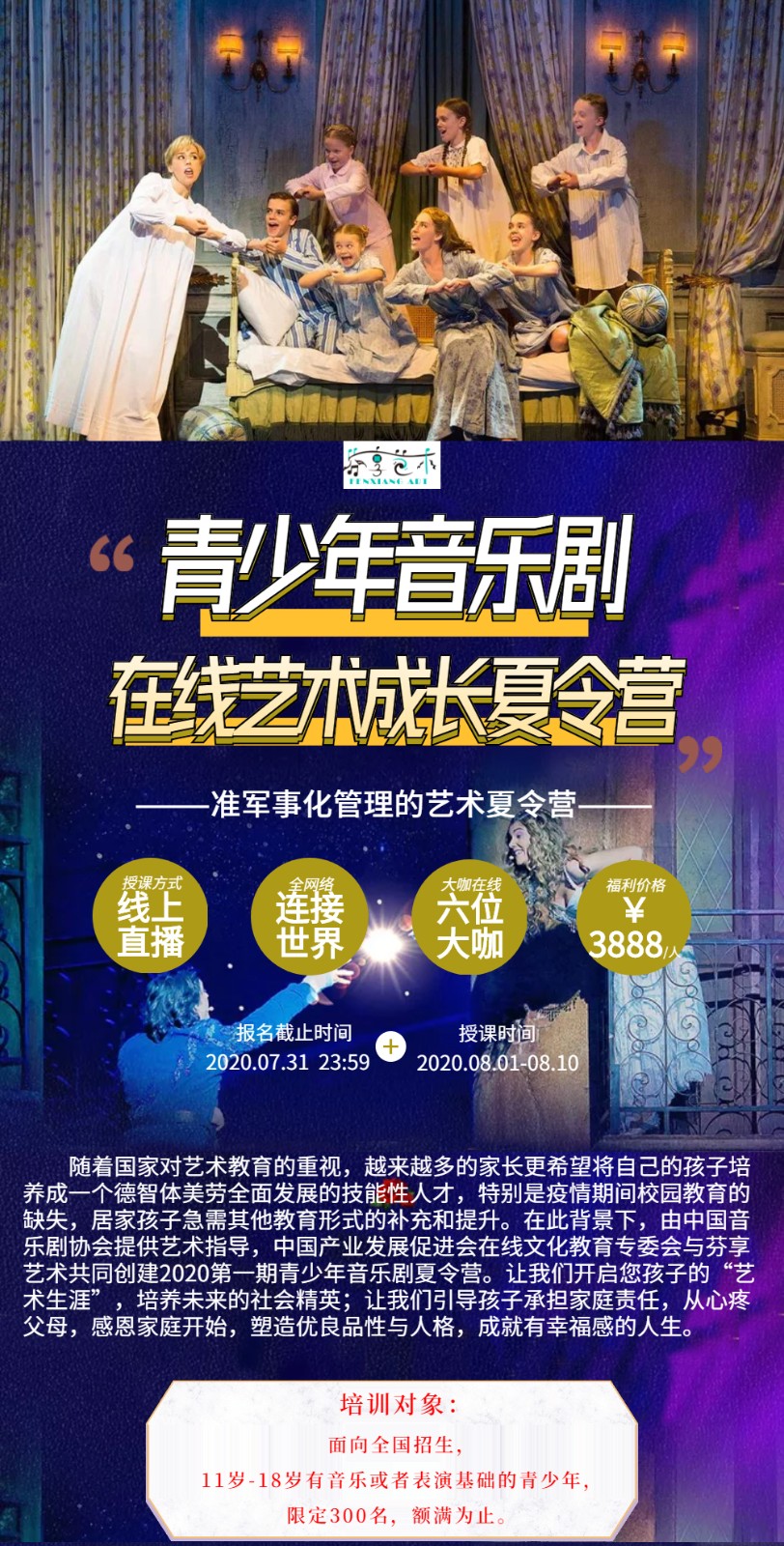 各位亲爱的中国铜雀台头条传媒朋友,由中国产业发展促进会在线文化教育专委会与芬享艺术共同举办的2020年第一期青少年音乐剧夏令营,让我们开启您孩子的艺术生涯,培养未来的社会精英,塑造孩子的优良品性和人格,在这里让我们引导孩子承担家庭责任,从心疼父母感恩家庭开始,成就幸福感的人生。“芬享艺术”青少年音乐剧在线艺术成长夏令营,准军事化管理的夏令营。授课方式 ——线上直播、全网络——连接世界、大咖在线——六位音乐大咖在线面对面授课、福利价格——每人3888元。报名截止时间:2020年7月31日23时59分,