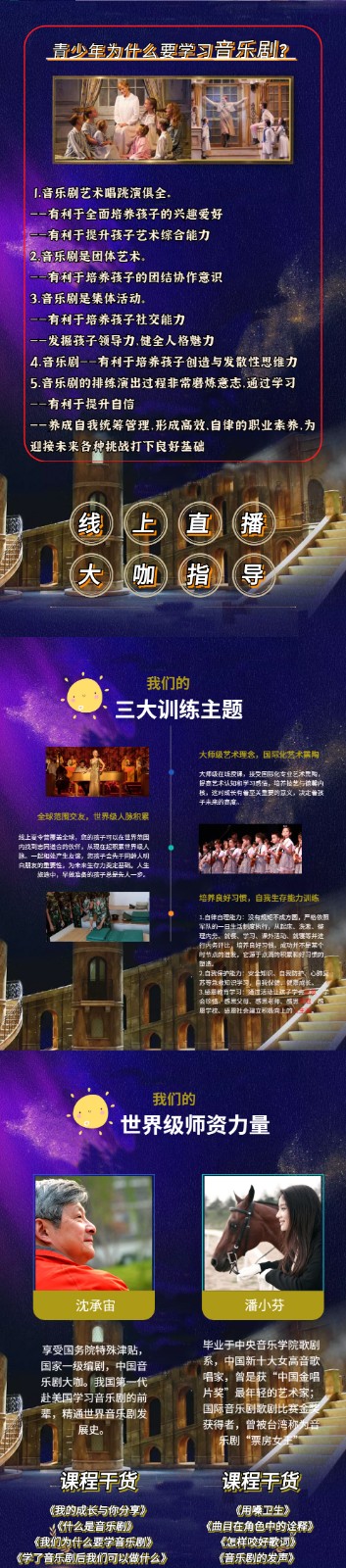 本次活动有国内顶级音乐剧及音乐艺术家教师团队组成。其中含有大课和一对一小课,每个人都需要认真完成自己的角色并相互协作来呈现一场完美的视频演出,体验不一样的艺术之美,帮助实现人格的全面发展。