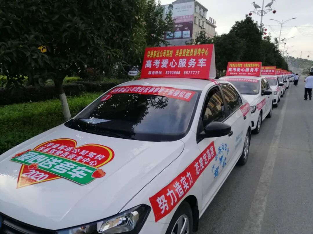 洋县客运公司驾校筹备的迎考助考爱心车上方,“洋县客运公司驾校洋县驾驶员训考中心高考爱心服务车”“全体教职员工祝考生金榜题名”“精神成就事业,态度决定一切”“自信饱满创佳绩,笑看人生赢未来”“风华正茂、志存高远、独占鳌头”“心情放轻松,好运不停息”“不惧困难不紧张,心态轻松无压力”等近百条励志标语向莘莘学子昭示着把握现在就是创造未来的美好祝福。
