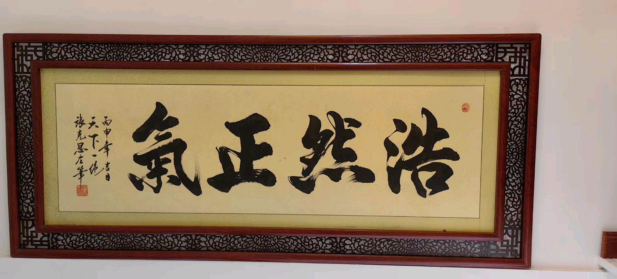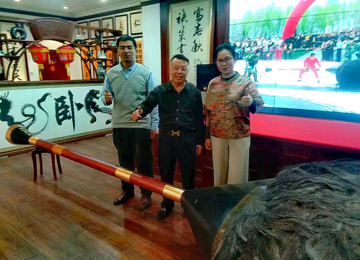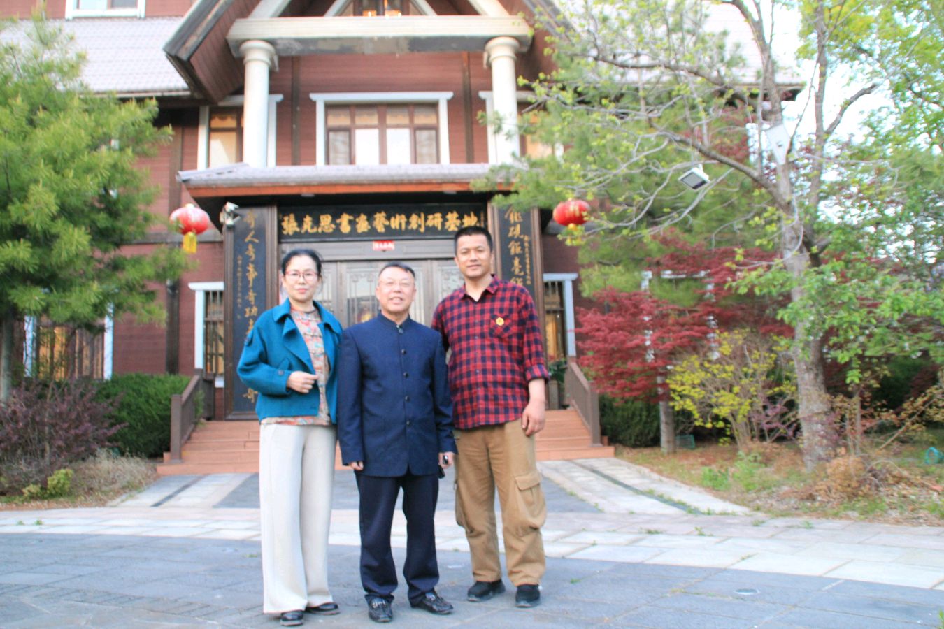 下午15时 ,张克思夫妇热情地接待了我们,并引领着我们一幅一幅参观,详细一一介绍,每幅作品创作的年代,用什么正写、横写、反书、空中悬书、左笔书法、两手同时左右开弓写,从一楼一直参观浏览到三楼,并在他写字绘画的特大书画长案上,为我们现场展示表演了书写了他的正书、反写、横写倒书的三幅书法墨宝作品,十三种写法一个方面冰山一角的真功夫演示。