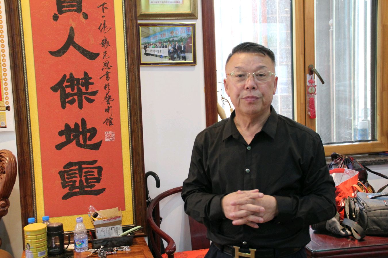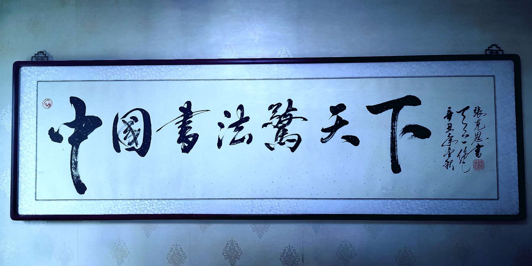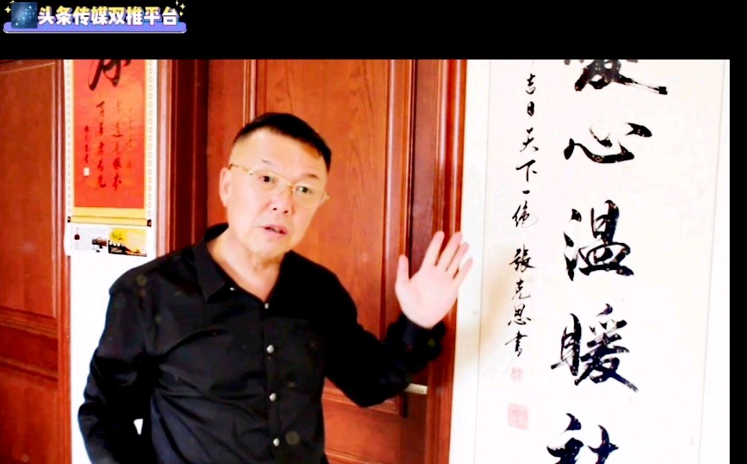 张克思先生,一身得体深色休闲装,头发剪梳得油亮一丝不乱,戴一付银色窄边圆镜片的眼镜,给人儒雅随和沉稳干练,又精明睿智的第一感觉,他的脸上时不时洋溢着的真诚和蔼又坦荡荡的笑,而且,人又颇健谈,说话那个是才情横溢、才思敏捷,真知锐见,底蕴深厚,聊起他的神州第一笔,和悬挂在他这个共有三层一千多平米,由数百幅他创作有八种不同写法艺术与审美水准极高的行楷草隶篆布置得艺术感拉满的作品展馆艺术殿堂,那是如数家珍滔滔不绝。这使我们对他的专访和摄制,就很轻松愉快也顺利了许多。