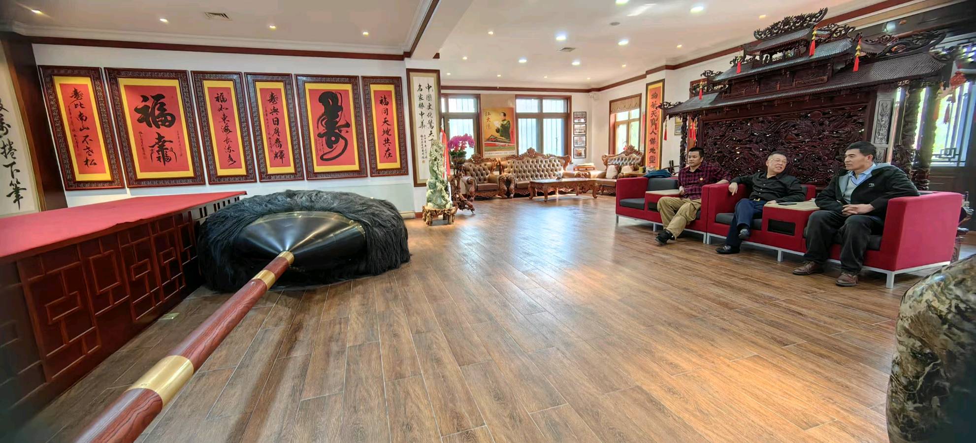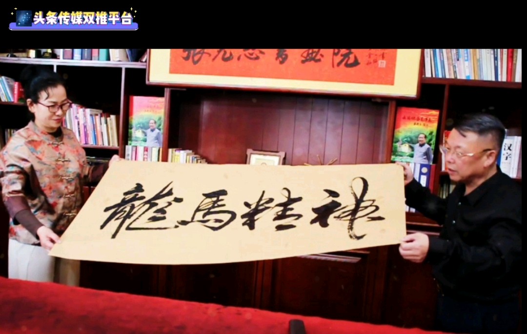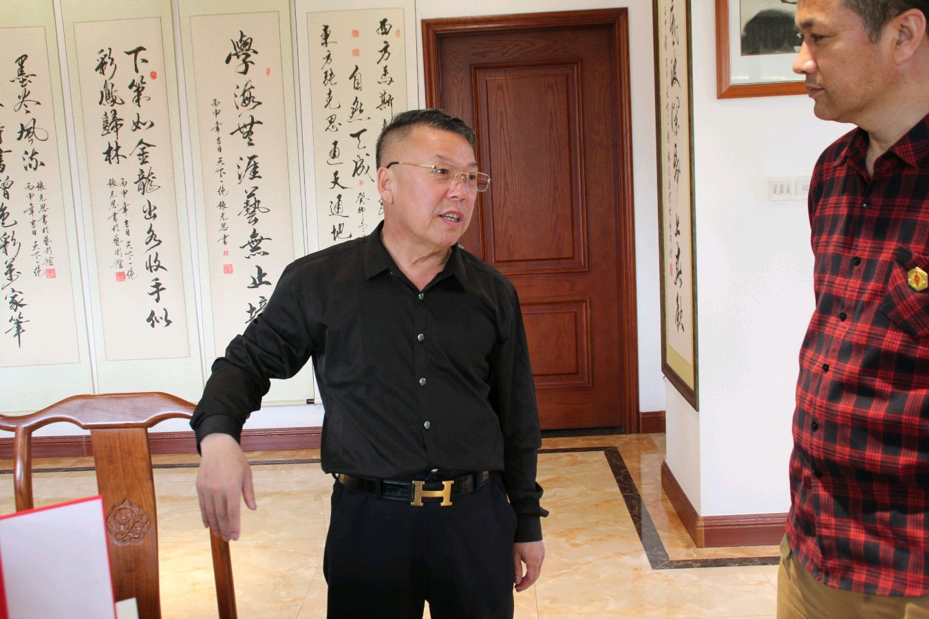 张克思先生,一身得体深色休闲装,头发剪梳得油亮一丝不乱,戴一付银色窄边圆镜片的眼镜,给人儒雅随和沉稳干练,又精明睿智的第一感觉,他的脸上时不时洋溢着的真诚和蔼又坦荡荡的笑,而且,人又颇健谈,说话那个是才情横溢、才思敏捷,真知锐见,底蕴深厚,聊起他的神州第一笔,和悬挂在他这个共有三层一千多平米,由数百幅他创作有八种不同写法艺术与审美水准极高的行楷草隶篆布置得艺术感拉满的作品展馆艺术殿堂,那是如数家珍滔滔不绝。这使我们对他的专访和摄制,就很轻松愉快也顺利了许多。