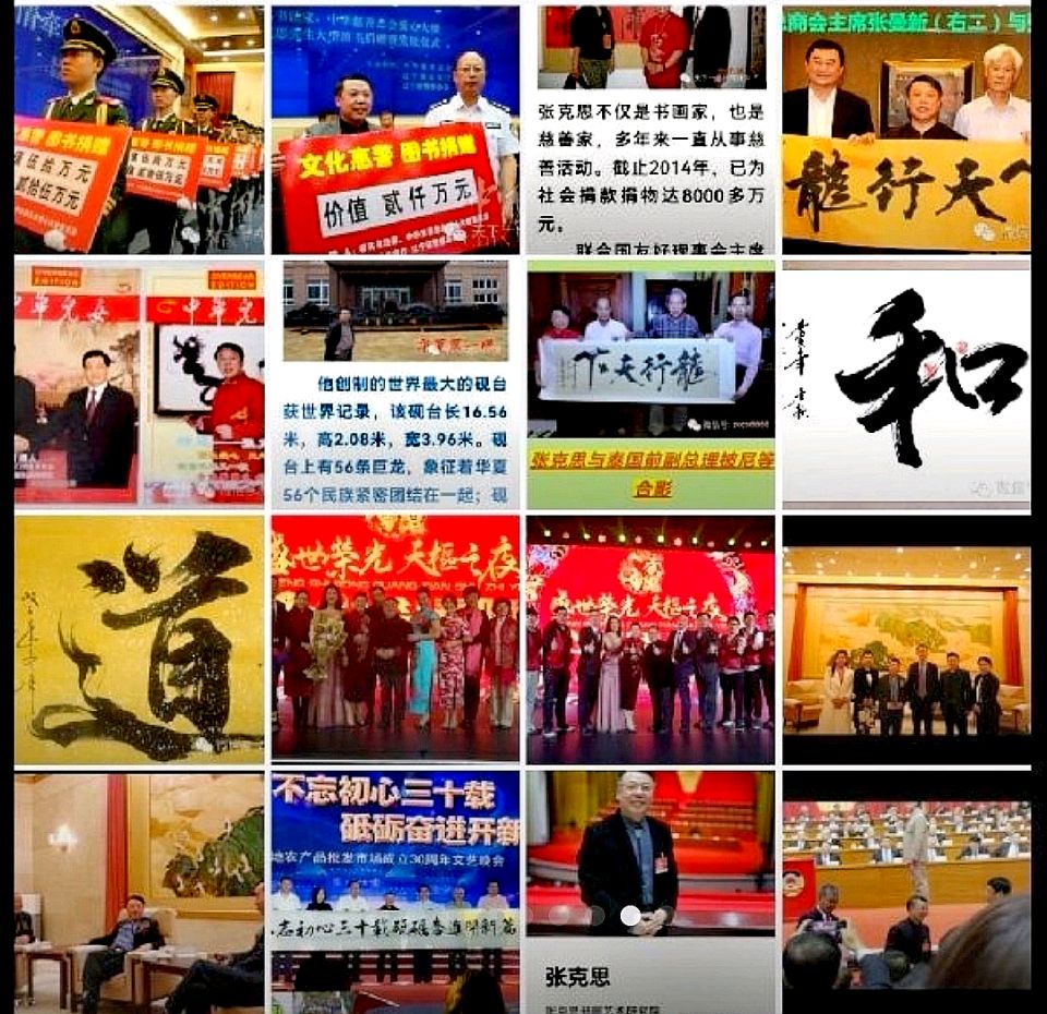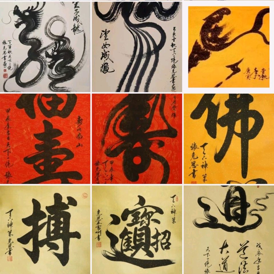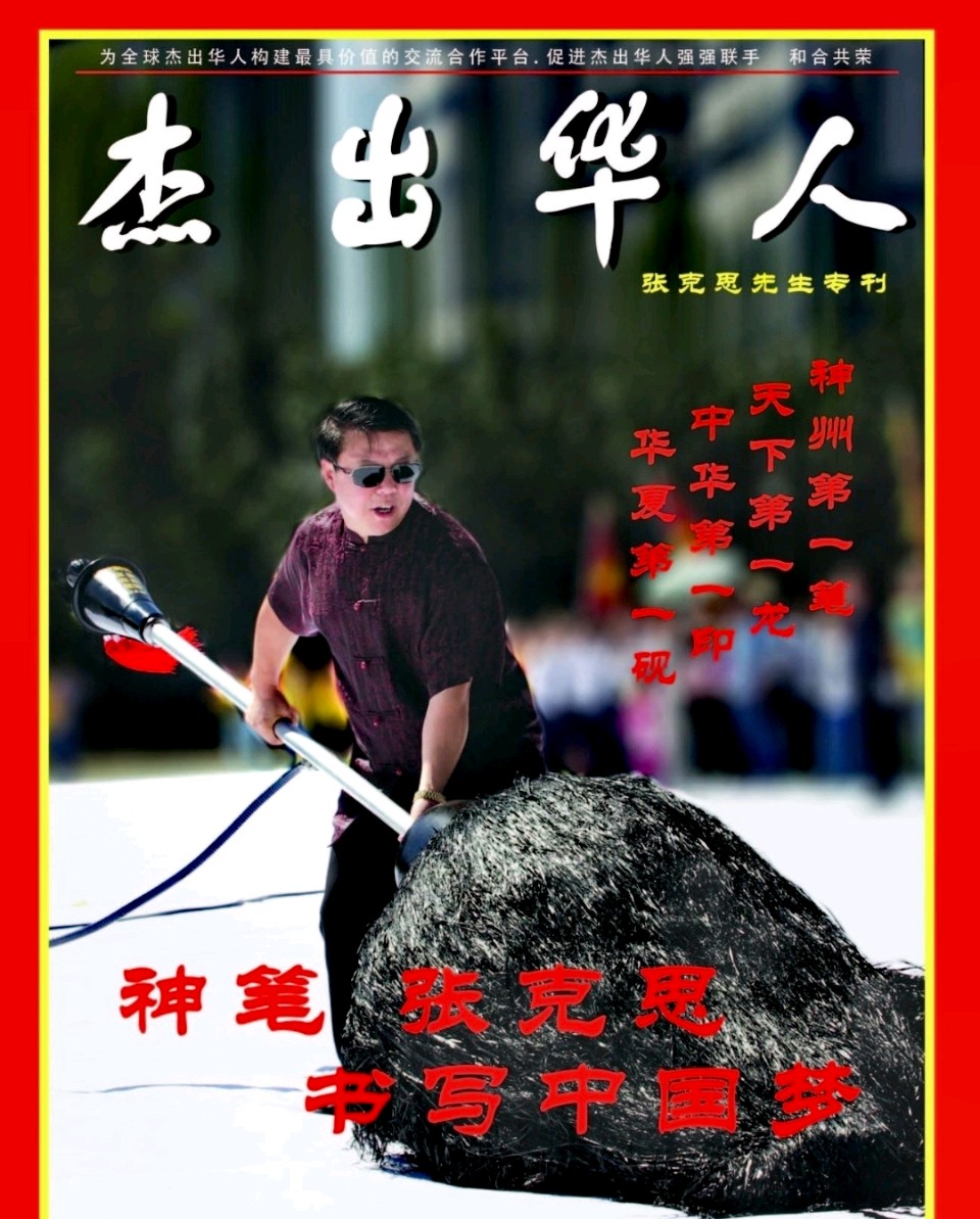 所以,他才能一次次创造性能要打破常规地上写、广场写、将来要会去哈尔滨的冰上写、新疆的大漠上写,白云朵朵下面天上写,用人造的笔写、用不是笔的毛巾写、用名牌汽车写、用摩托车写,用直升飞机等来写,中文和数十种不同国家民族文字的书写,这不是狂言瞽说,据书法界一位知名书法家挚友说:书法,书法,是一种书写写字的方法!对于许多人所说,也许,只有一种,而他张克思先生大师却有十三种,难道这不是一个奇人?这不是守正创新的出离传奇?这不是将中国的书法艺术颠覆式的引领,创造奇迹与未来,走向国际吗!