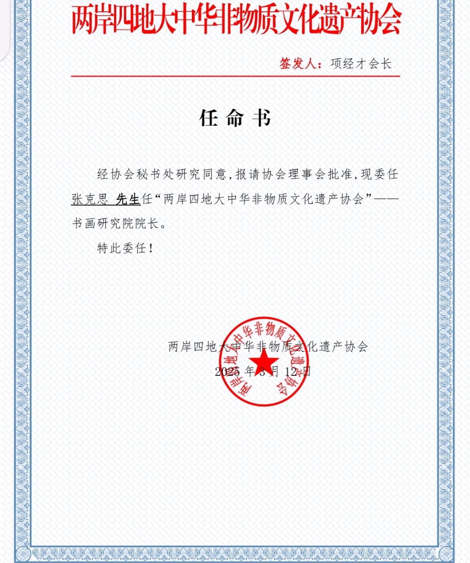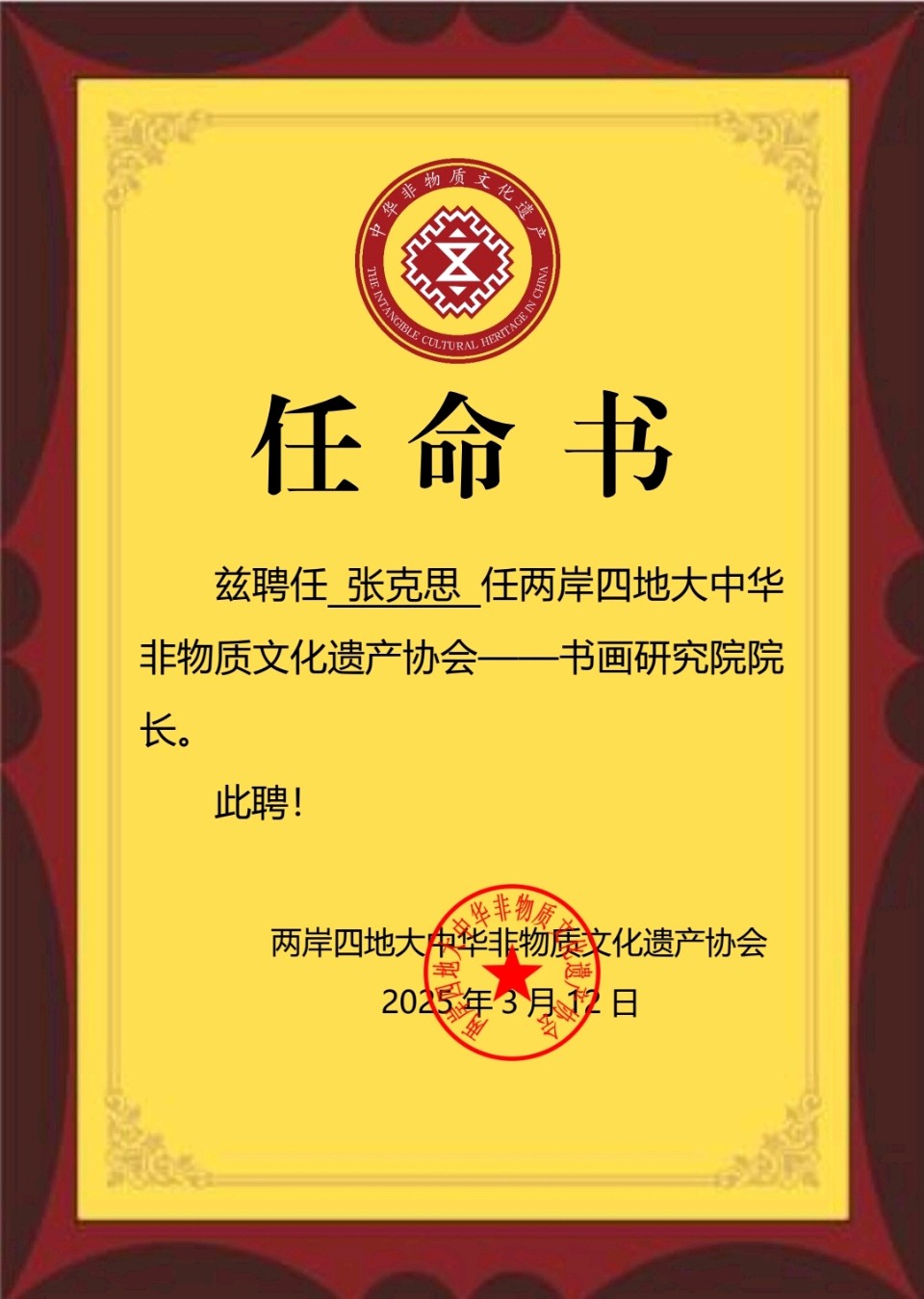 “张克思,世界级书法大师,著名社会活动家和慈善家,联合国授予“最有影响力”书画艺术家,中国书画院副院长,中国国际书画艺术研究会中艺联合美术院书法研究室主任,中华老兵全球书画艺术院院长,2024年11月25日聘请张克思为渤海大学客座教授,中华慈善总会关爱青少年爱心大使,慈善家、社会活动家、辽宁省残疾人福利基金会名誉理事长、爱心大使,辽宁公安司法管理干部学院终生荣誉教授,大连外国语大学客座教授,原辽宁省政协委员,大连市非物质文化遗产张克思反写倒书传承基地书法传承人。中华人民共和国文化部颁发高级书法证书!已入编《中国书法史》!为中国酒泉卫星发射中心题字!并入选中国文化品牌人物!中国非遗传承年度代表人物等。