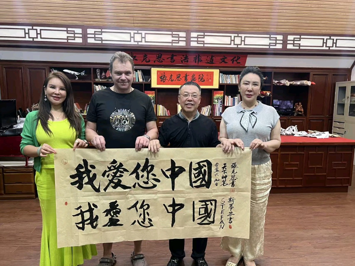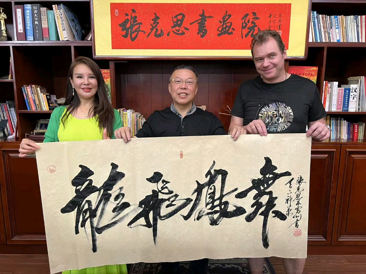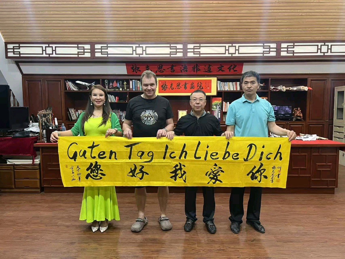 2025年6月9日下午,一笔宗师世界书法名家张克思大师与德国斯蒂芬先生在张克思书画院中德文书法创研交流视频 一 △