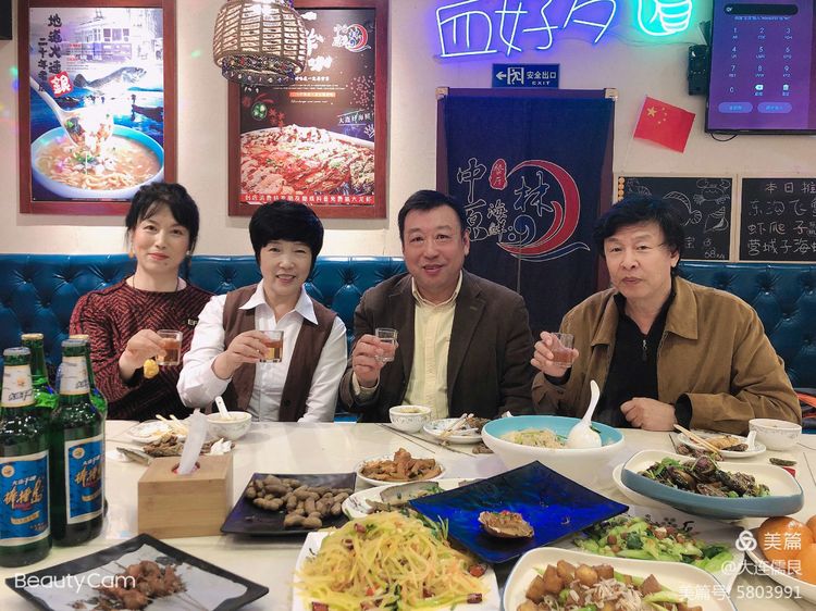 酒喝到微醺,人散到情浓时。我们在店门外合影留念,头上方高悬就是中原海鲜餐厅,三十年老店牌子,身旁就是海鲜水产活养玻璃多层展缸摆柜,刘姐说喝的刚刚好,没喝丢绣花鞋,两只高跟鞋都在!