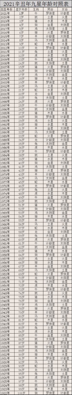 男水星、女木星:虚岁年龄12(2010年出生),21(2001年出生),30(1992年出生),39(1983年出生),48(1974年出生),57(1965年出生),66,75;