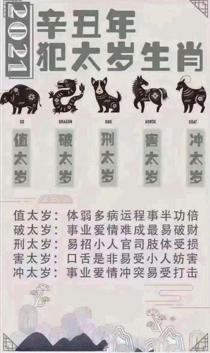 农历2021年是从立春节气,即2021年2月3日23时0分开始的。太岁值神杨信星君,太岁位东北方,岁破位西南方。犯太岁的生肖有:属牛人值太岁,属羊人冲太岁/刑太岁,属马人害太岁,属狗人刑太岁。