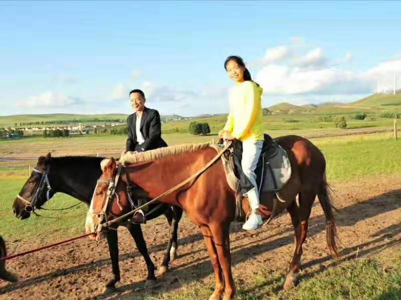 是日下午,我们一家来到景区一处马场。在孙女的强烈要求和导游的极力怂恿下,我和老伴、孙女还有儿媳兴意盎然地体验了一次草原骑马行的乐趣。“马儿啊,你慢些走”的音乐声中,第一次与马亲密接触并跨身马背骑行在广袤草原上的我们,感觉紧张而又刺激,惬意极了!
