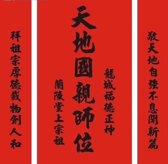 天者,宇宙也。地者,地球也。君者,国家之主也。亲者,父母也。师者,老师也。此五者,平常百姓之家,中堂敬之奉之。那中堂族谱祀堂上,中间便有天地君亲师,左右两旁写着九天司令,太乙府君,然后才是族出何处,追根溯源。如老