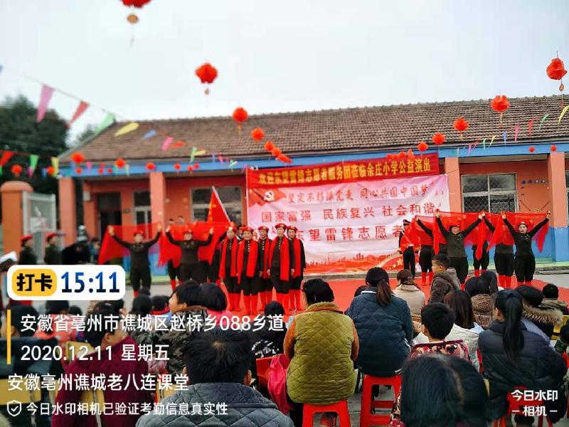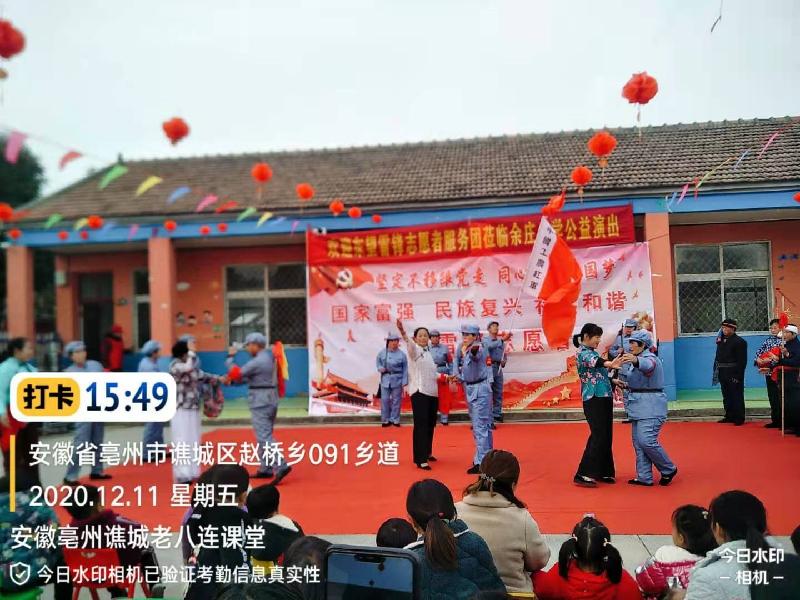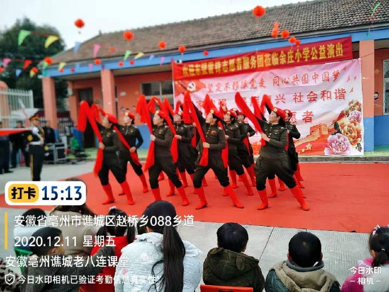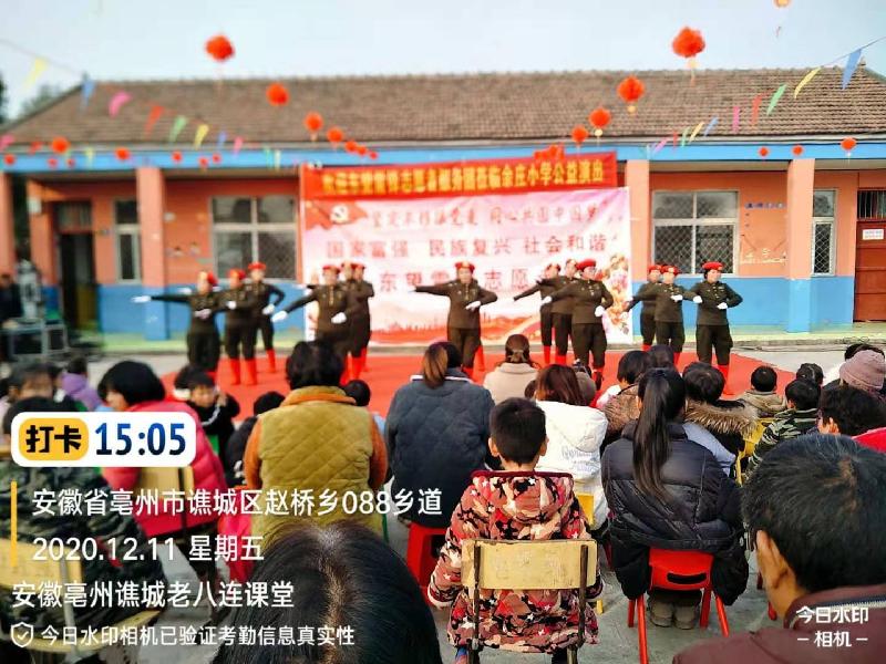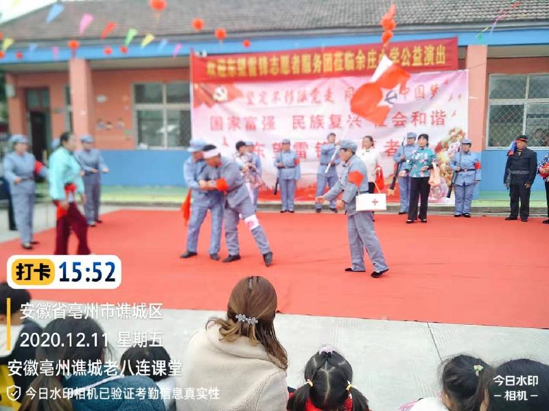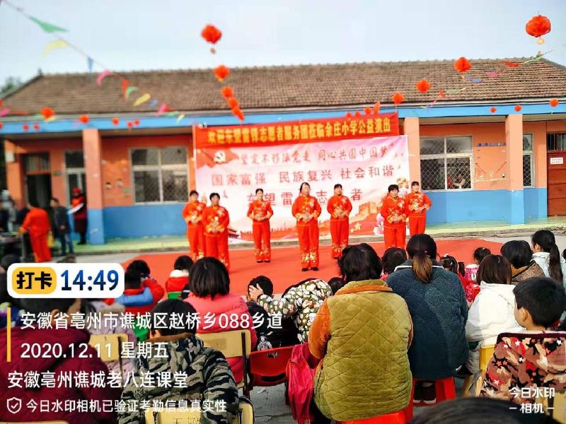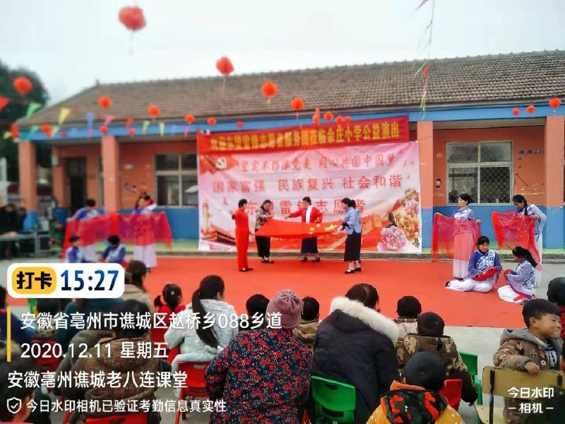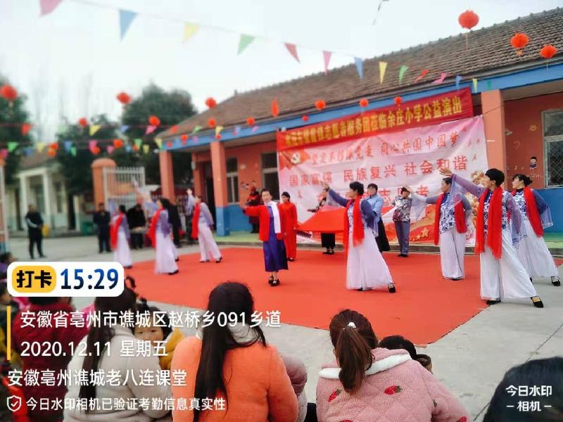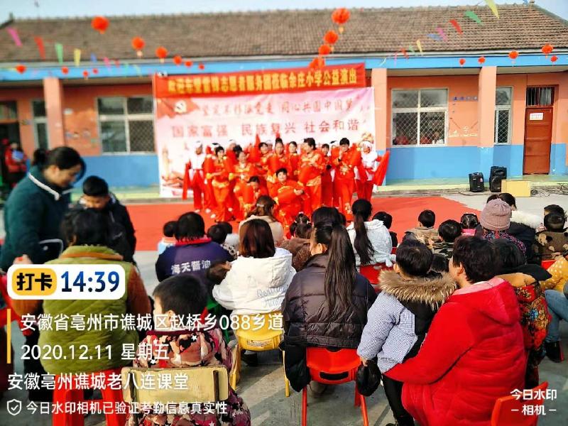 志愿者本着传承红色文化基因,弘扬爱国主义精神,把优秀的传统文化和毛泽东思想深入人心,2020年12月11日,应安徽亳州谯城区赵桥乡余庄小学的邀请,东望集团安徽亳州谯城老八连、善缘、聚缘课堂的45名志愿者,来到余庄小学为师生和家长们进行一场文化盛宴。