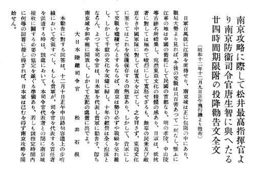 (12月9日,侵华日军华中方面军司令官松并石根给正在抗战的南京卫戍司令唐生智24小时期限的劝降书。)