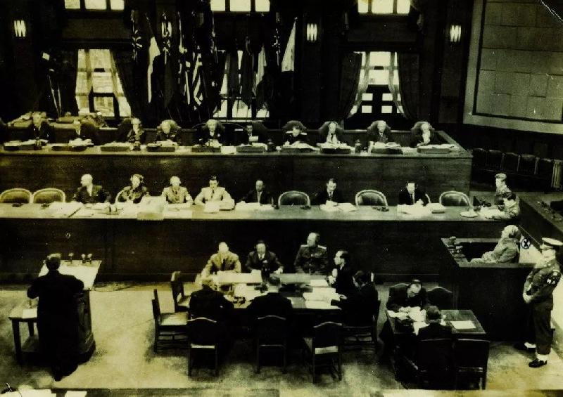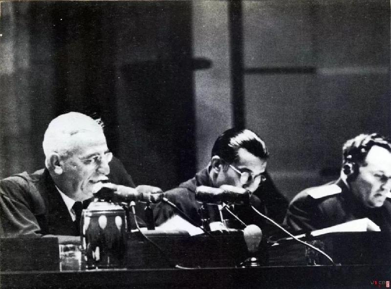 (中国国际法学家梅汝璈〈中〉在东京审判审判席上)
