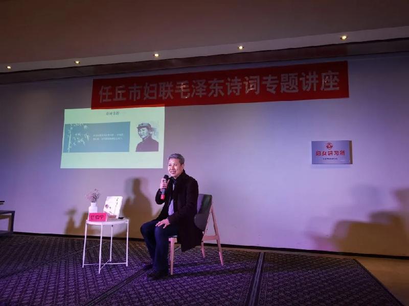 12月15日下午,任丘市妇联为源平美璟书店颁发“任丘市妇女讲习所”牌匾,并举办了“任丘市呵护志愿梦想 共筑和善任丘 志愿服务项目化签约仪式“后的第一场讲座——任丘市妇联毛泽东诗词专题讲座。邀请省作协会员、任丘市华油书协副主席任伯宁老师讲授了毛泽东诗词。