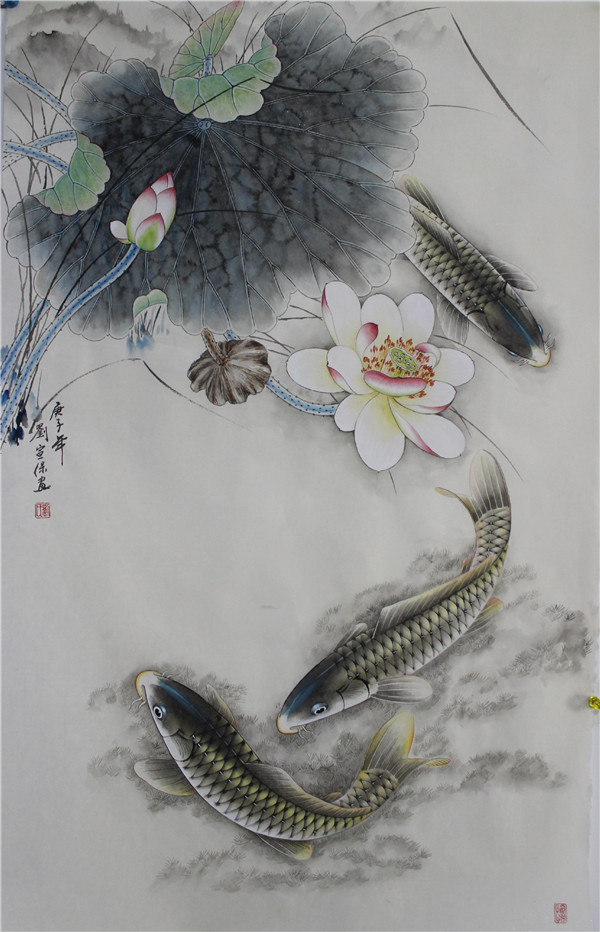 “画鱼须得活泼,得其游泳像。见影如欲惊,硷喁意闲放。浮沉荇藻间,清流姿荡漾。悠悠羡其乐,与人同意况。若不得其神,只徒肖其状。虽写溪涧中,不异砧俎上。”刘宣保画作深得其妙。鱼儿在长满水草的水中,自由自在地漫游着,或聚或散,或浮或沉,轻巧灵动。碧水荡漾,萍藻摇曳,极其鱼水之乐。