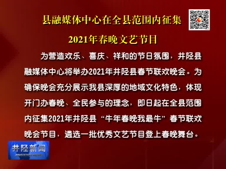 为营造欢乐、喜庆、祥和的节日氛围,井陉融媒体中心将举办2021年井陉县春节联欢晚会。为确保晚会充分展示我县深厚的地域文化特色,体现开门办春晚、全民参与的理念,即日起在全县范围内征集2021年井陉县“牛年春晚我最牛”春节联欢晚会节目,遴选一批优秀文艺节目登上春晚舞台。