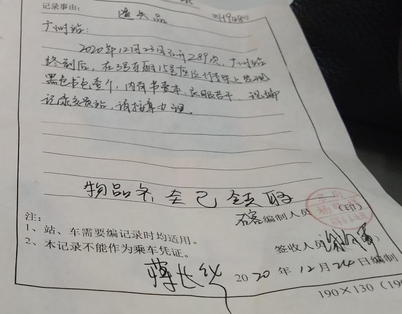 我按照列车员的吩咐,前往广州站服务总台领取。总台工作人员热情的接待了我,并与我一起核对了行李内的物品,物件亳无差错,原物交到我手中。失而复得,我心情十分激动,一时语塞,竟说不出更多的感谢话。今天,我写这封感谢信,深情地向那位不知姓名的手机号为13832380586的Z98次列车乘务员,由衷表示感谢,向他鞠三躬!!!