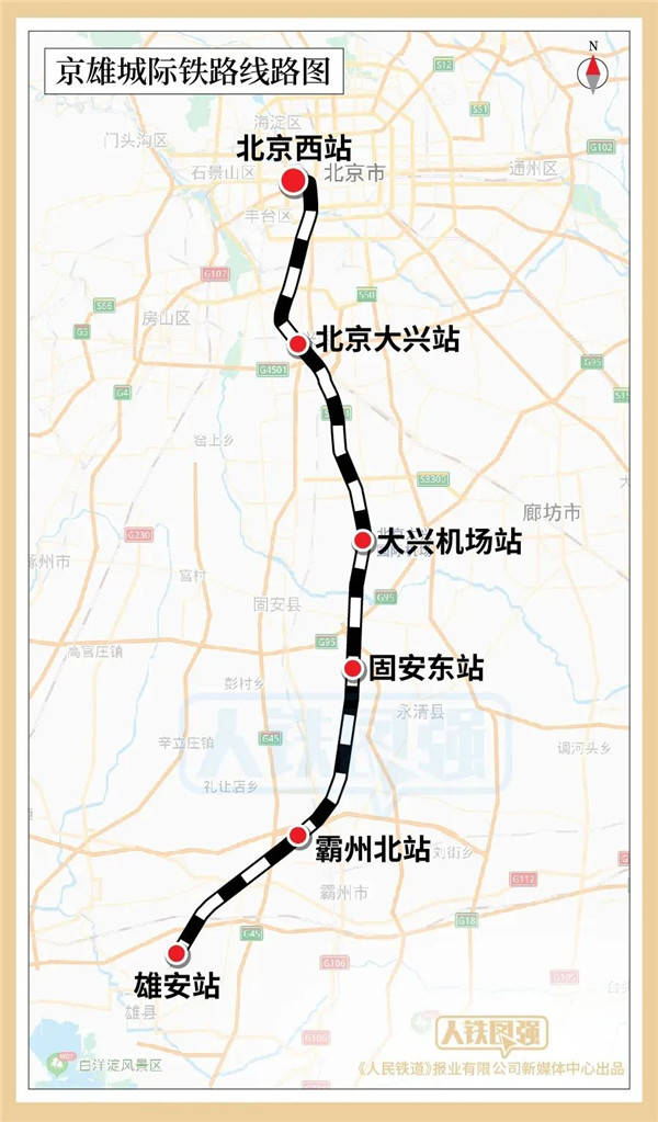 市大兴区、河北省廊坊市、霸州市至雄安新区,线路全长91公里,最高设计时速350公里,其中北京