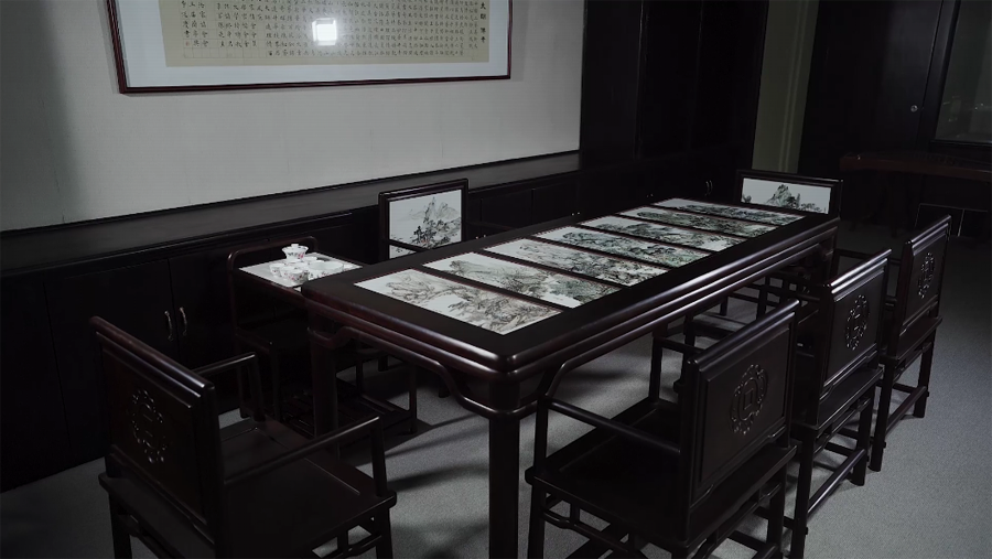 《南州寿峰—乐山篇》瓷木作品,是红木家具与瓷画艺术的一次跨界融合,典雅而奢华,古朴自然而高贵,展现“乐山乐水得静趣,一丘一壑自风流”的艺术风范。