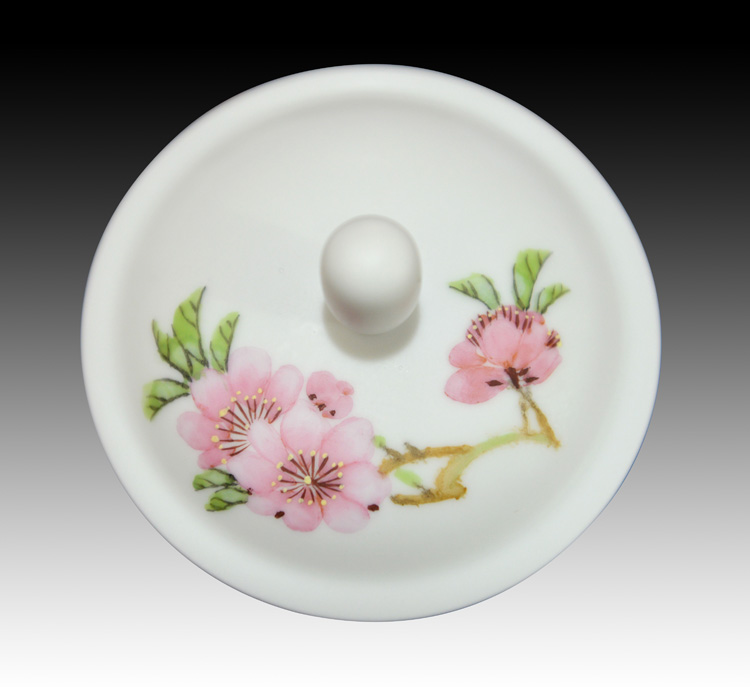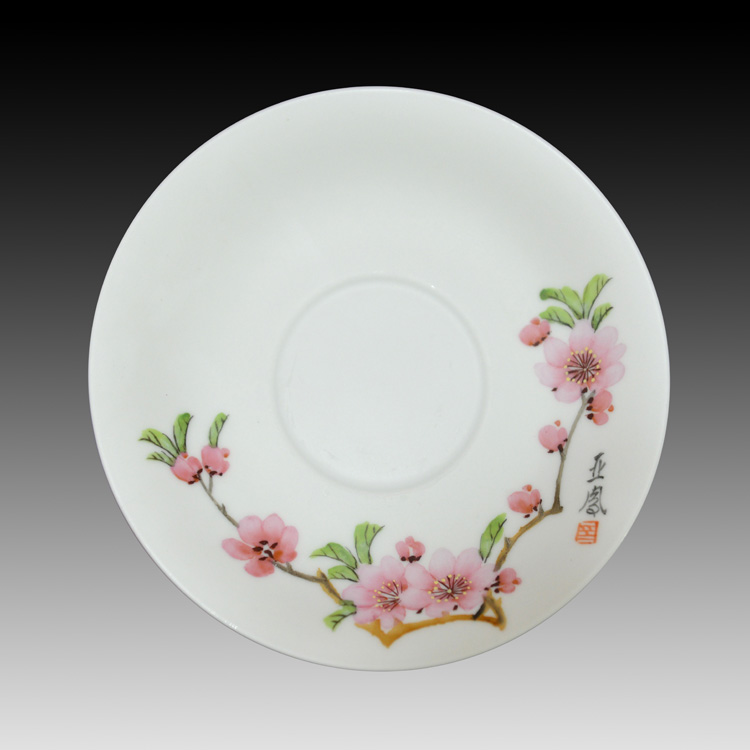 《水点桃花》带碟杯为中国工艺美术大师、7501毛主席用瓷主创人员之王徐亚凤女士创作。画面细而不腻,工而不板。桃树枝干疏密有致,淡雅粉红的桃花随枝点染,端庄而秀美,艳而不俗。呈现出生机盎然的春天美景。