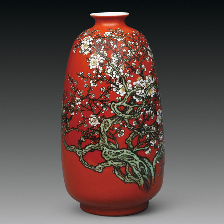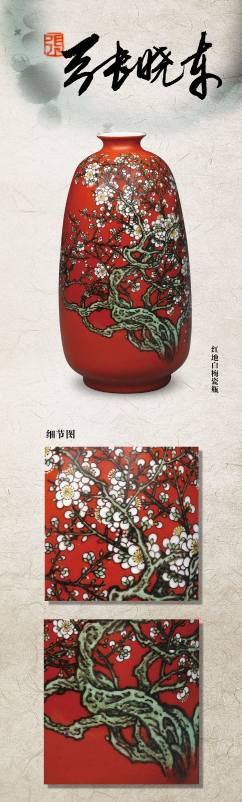 釉上彩《红地白梅》瓷瓶,为江西省工艺美术大师张晓东设计绘制。以红为底色,梅树枝干纵横交错,盘虬怪异,劲如弯铁,刚健有力;白梅组织自然,形态各异,英姿勃发;尤其黄色点缀的花蕊,恰到好处,颇具精神,寓意梅花不畏严寒,清香沁人,迎待万紫千红春天到来的高贵品质。作品高洁、清晰、凝聚,疏密得当,赏心悦目。