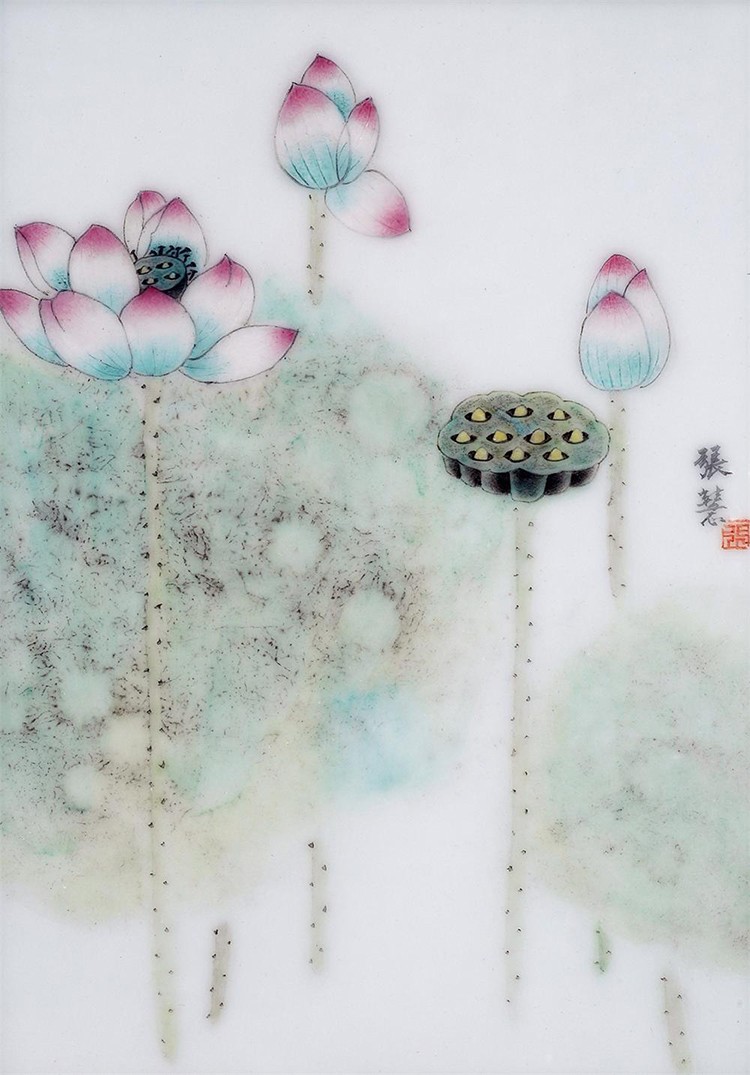 《荷花》为江西省工艺美术大师张慧创作绘制。作者为中国工艺美术大师张松茂、徐亚风之女,幼承庭训,功底扎实。马蹄莲为近年新兴花卉,因其形状独特,宛如马蹄,故名。画面挺劲的花朵清雅美丽,纷披的花叶纹络晰明,寓意忠贞不渝,永结同心。作品构图优美,立意深刻,色调对比显目为,装饰效果极佳。