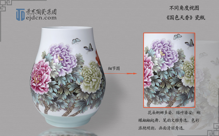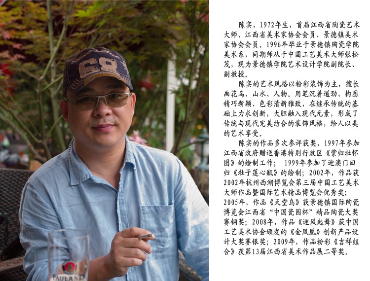 《国色天香》为首届江西省陶瓷艺术大师、景德镇陶瓷学院艺术设计学院副院长、副教授陈实创作绘制。作者师从中国工艺美术大师张松茂先生,基本功扎实。厚实盈满的牡丹花,栩栩如生的蝴蝶,勾勒用笔细润、劲利;色彩柔和、明亮,作品疏密井然有序,构成一幅生机勃勃、春意盎然的画面。