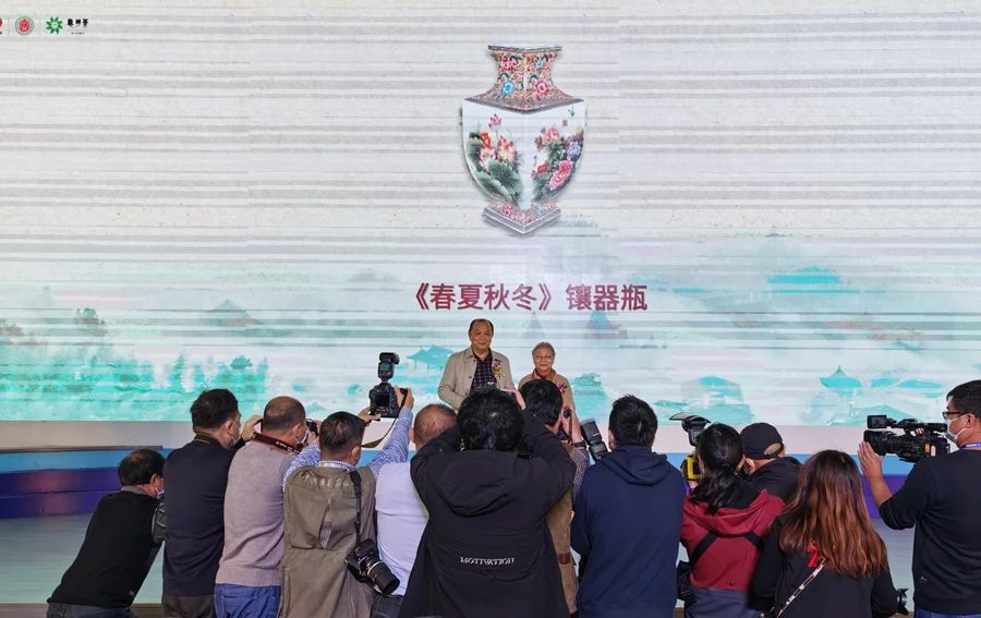 张晓东董事长为了祝贺上海惠明茶禅美术馆的成立,带来自己的作品粉彩《春夏秋冬》镶器瓶,并将此精美器瓶捐献给上海惠明茶禅美术馆。粉彩《春夏秋冬》镶器瓶表达对自然的颂歌、对生命的热爱和追求,以四季恬美景物为主题,遐思无限,境界优美,画面饱满,气势非凡,展现中国陶瓷艺术之美,讲述如四季花卉般缤纷灿烂、处处生机的中国陶瓷故事。