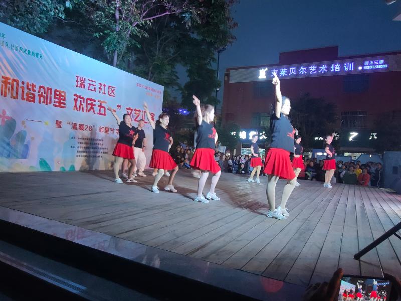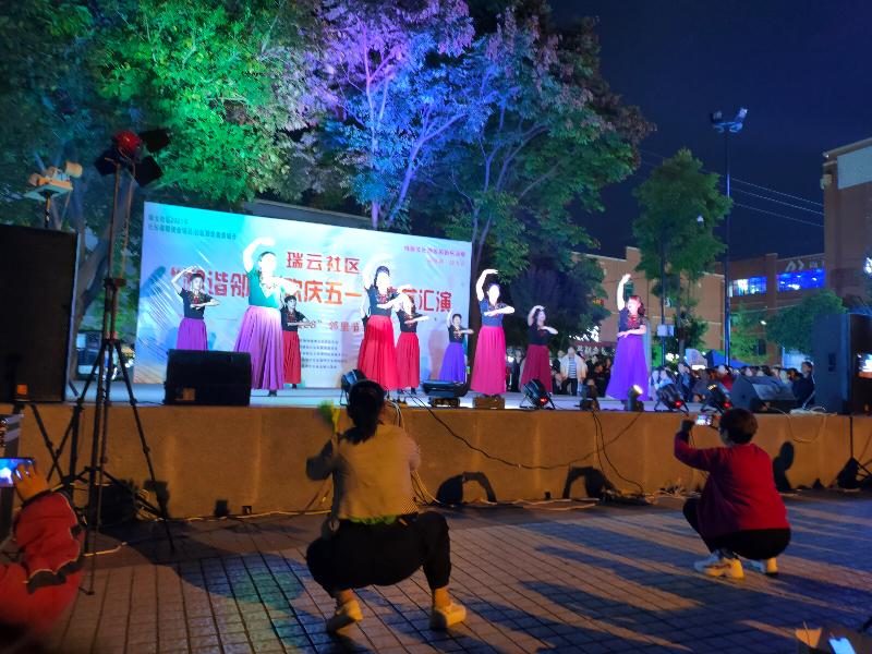 2021年4月28日晚7点,瑞云小区广场遍满了观众,观看五一节文艺汇演。闪耀的灯光和音乐的节奏,让一个个精彩演艺闪亮登台。