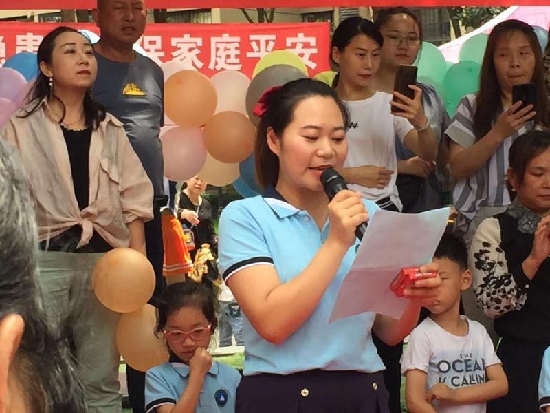 幼儿园老师精美地主持活动内容,在音乐伴奏中共唱起国歌。孩子们拿着国旗摇着,和家长、老师欢快共跳起来。