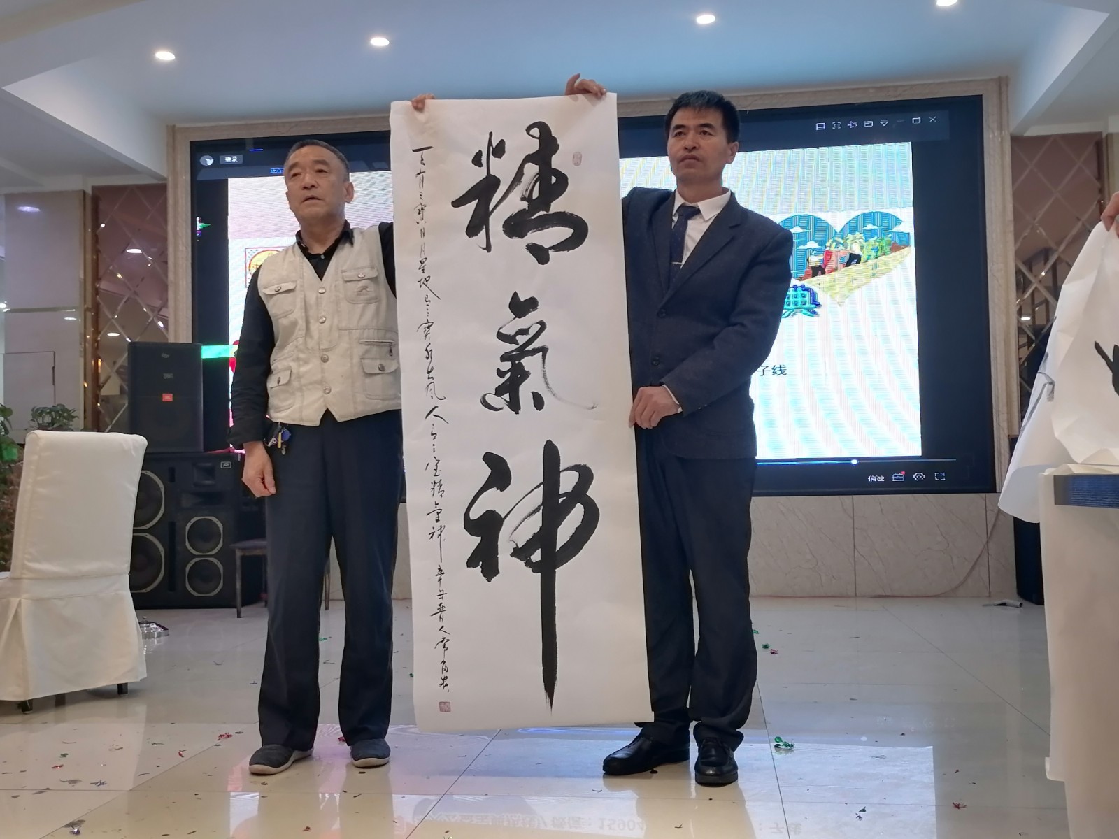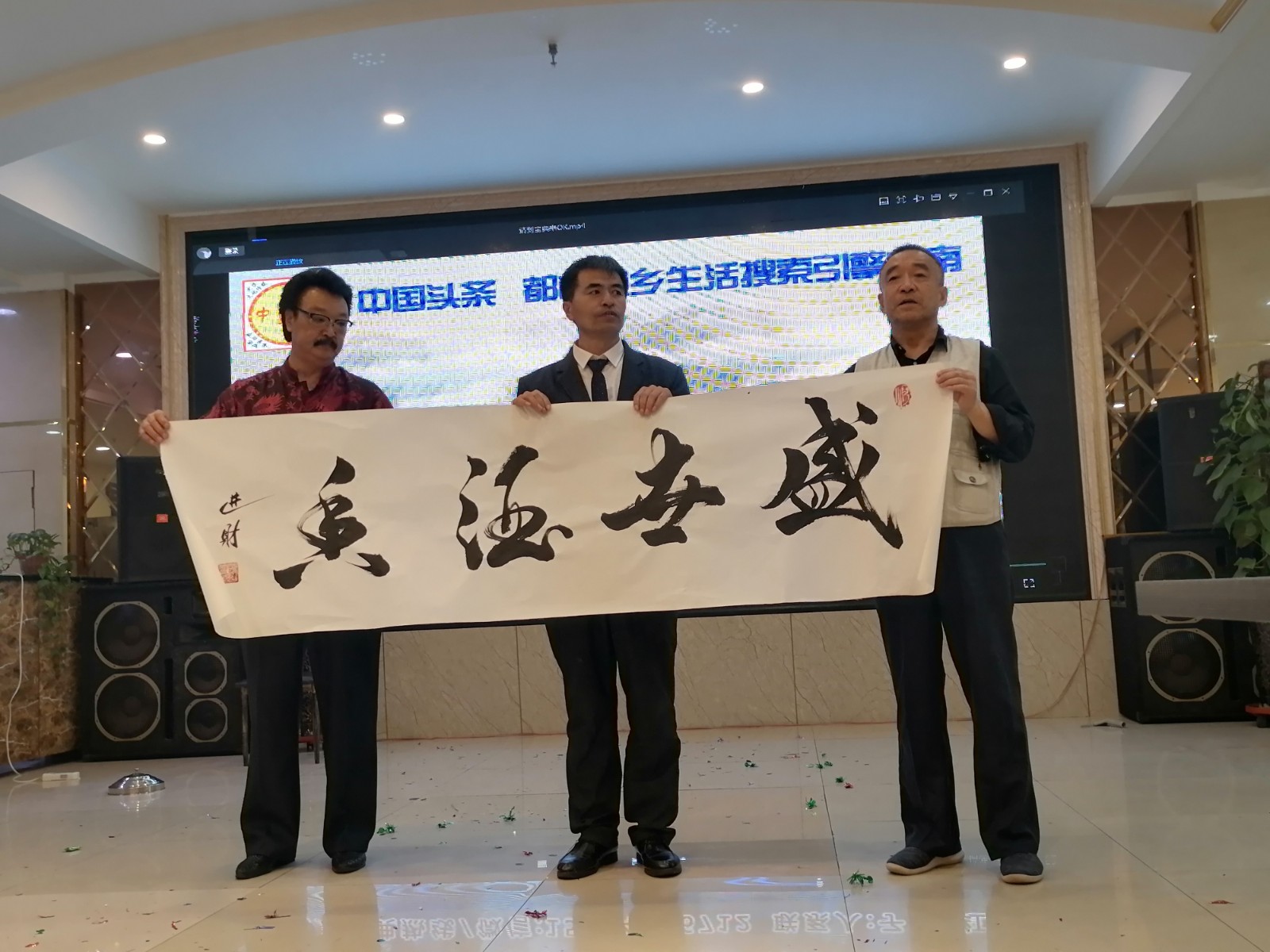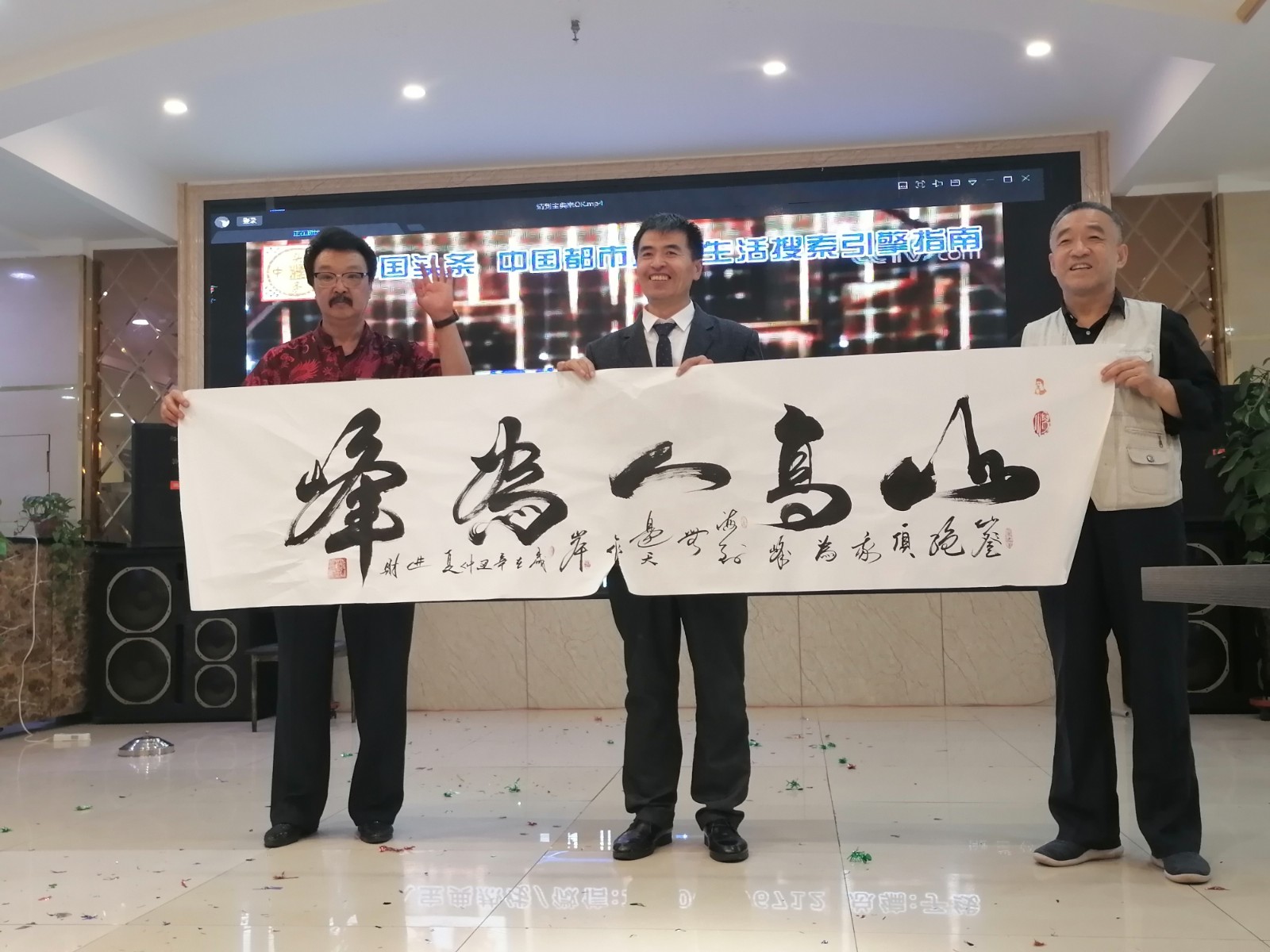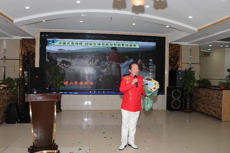 阿宽海鲜小渔港二楼宴庆礼宾大厅里,能容纳百人以上,今天这里离正式开始还有15分钟就已高朋满座嘉宾云集,礼宾厅内一派诗书画印剪纸歌咏盛典艺术浓郁扑面的气息氛围。