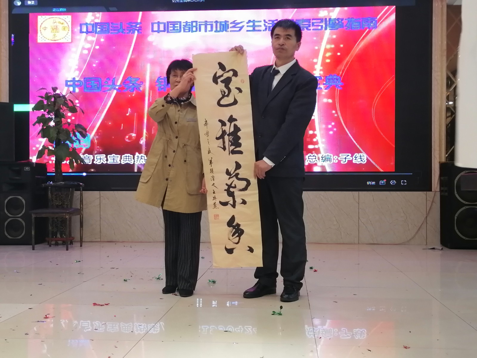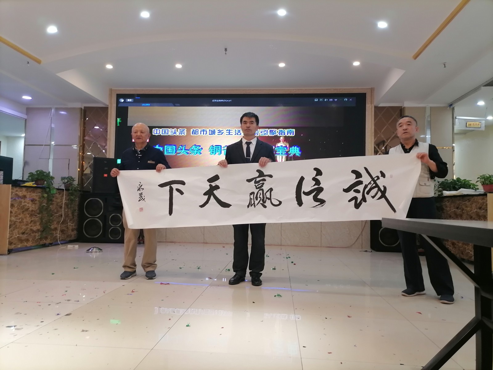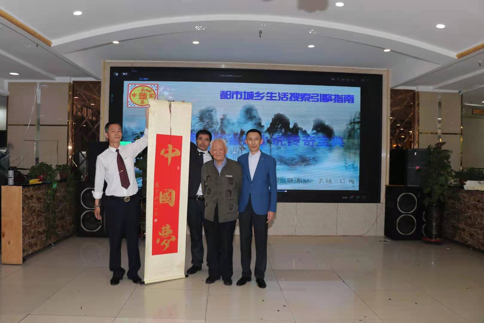 阿宽海鲜小渔港二楼宴庆礼宾大厅里,能容纳百人以上,今天这里离正式开始还有15分钟就已高朋满座嘉宾云集,礼宾厅内一派诗书画印剪纸歌咏盛典艺术浓郁扑面的气息氛围。