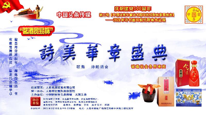 诗书画印歌咏艺术有着同样的中华文化之根,为促进多种文学文化文艺家之间的交流,迎接建党100周年, 2021年5月30日上午9点30分许,由中国头条传媒主办,大连茗酒贸易有限公司独家冠名,大连李达医疗美容整形医院第一协办、大连海定根诗社、黑龙江镜泊湖庆博石板贡米等协办,大连阿宽海鲜小渔港承办的2021中国诗美华章诗书画印剪纸歌咏春展盛典第二场在阿宽海鲜小渔港二楼宴庆礼宾厅拉开了书画艺术的序幕,响起朗朗的诵诗声,优美的旋律脍炙人口的歌声。