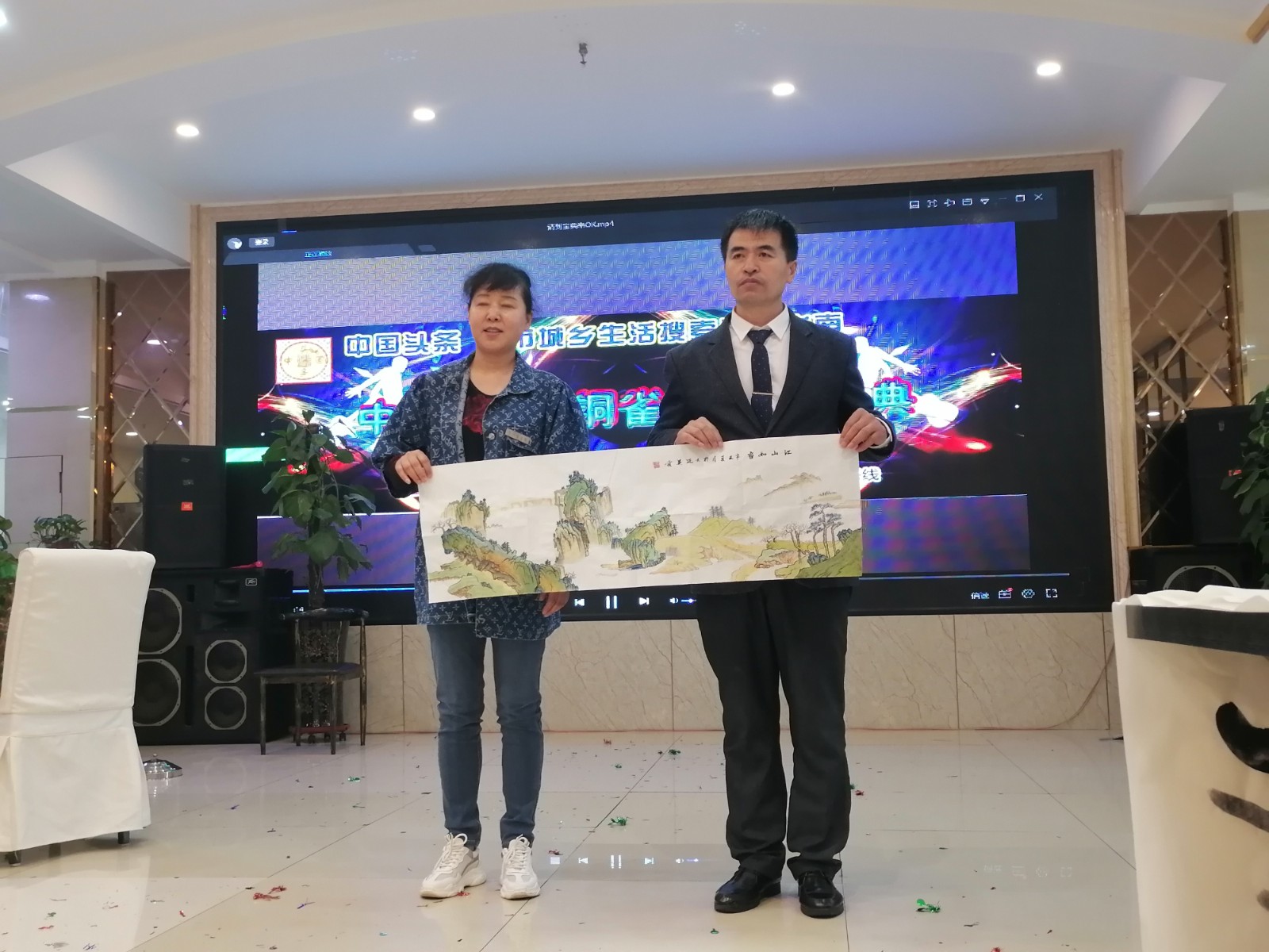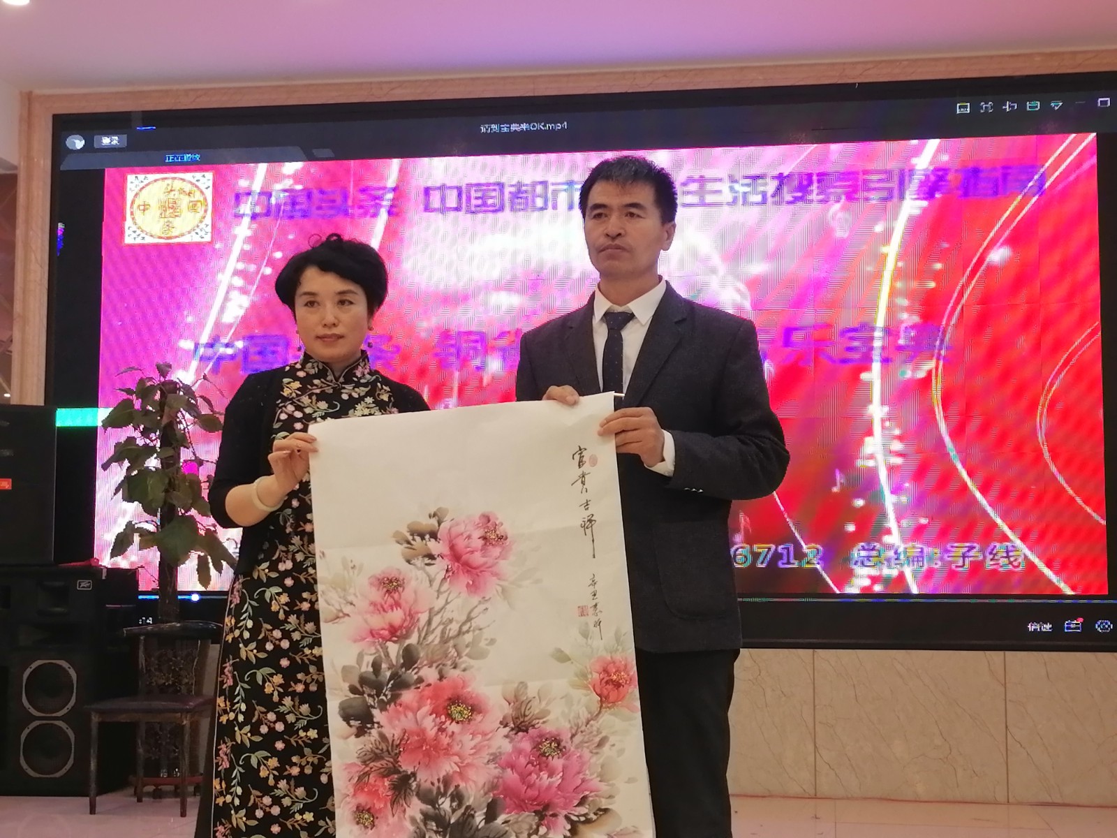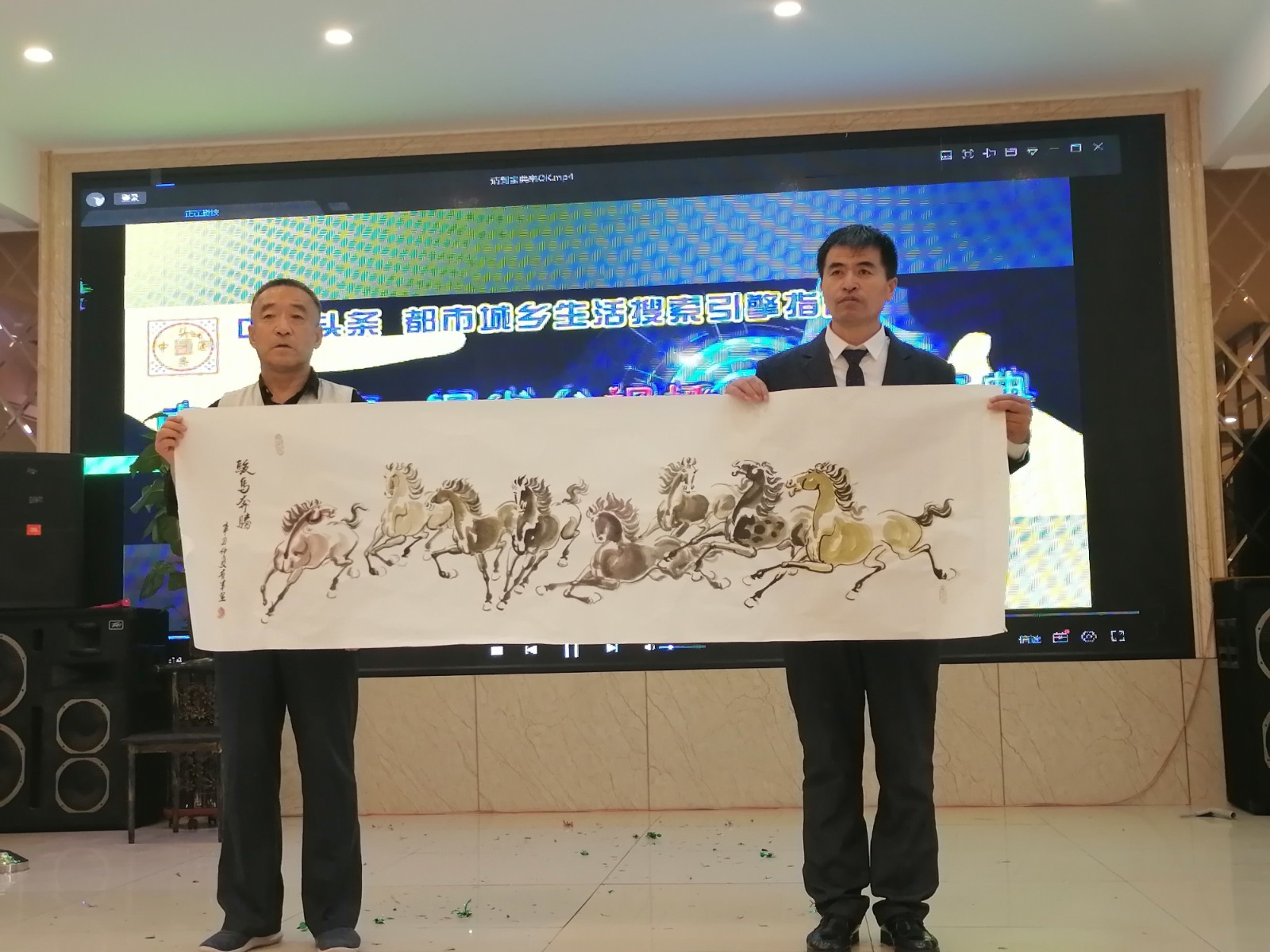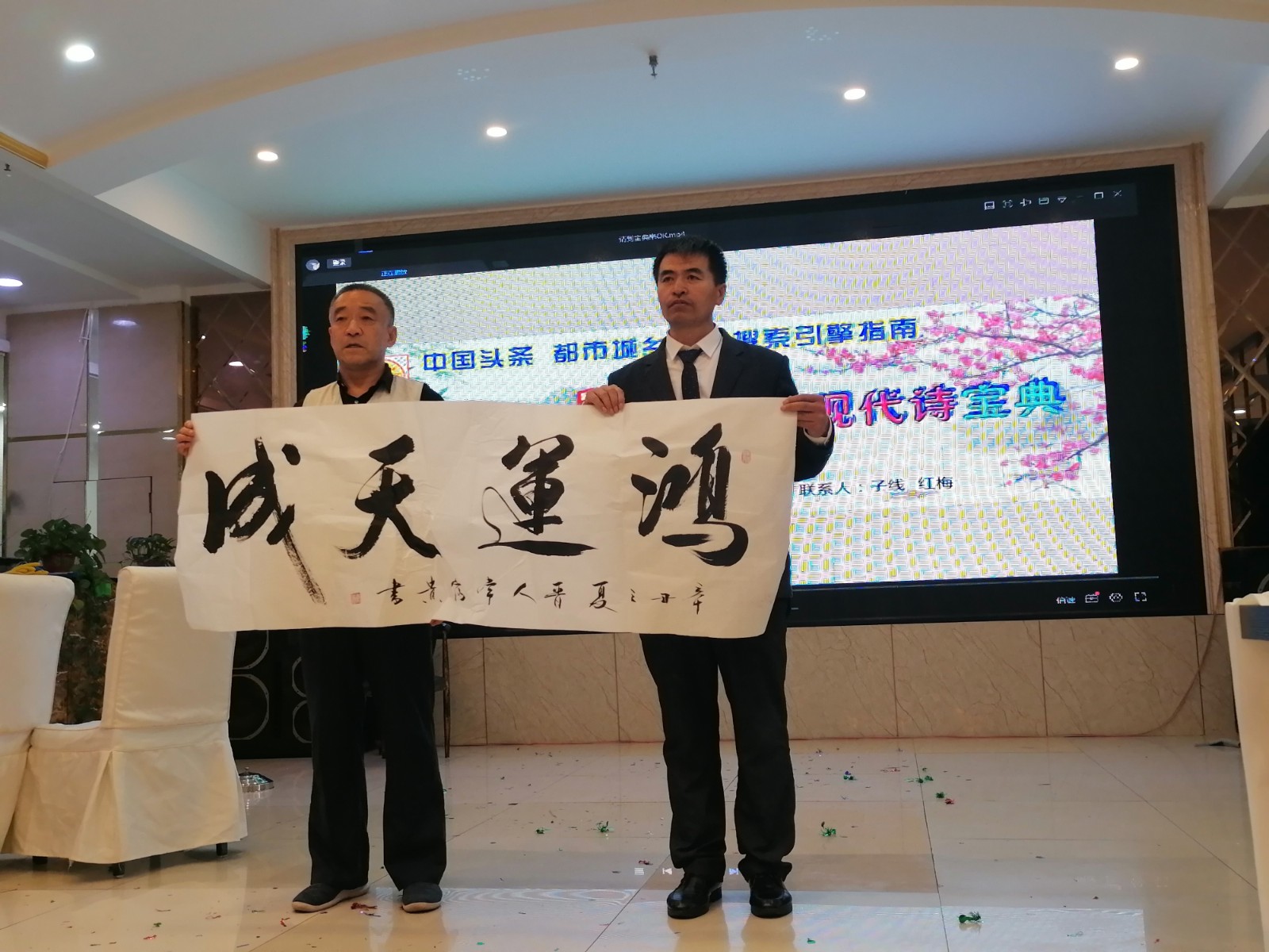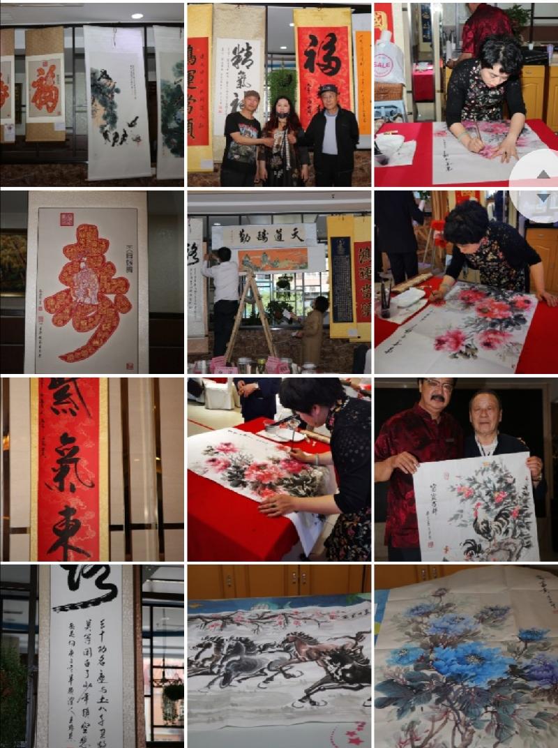 在阿宽海鲜小渔港二楼宴庆礼宾厅,第二场诗美华章春展盛典艺术家、企业家同社会各界人士一起参展和观展。在这宴庆礼宾厅的两厢张挂布展了四十余幅十二位参展书画和剪纸老师们的墨宝丹青作品,在阿宽宴会大厅LED舞台两侧书画长桌,墨雨书院的墨雨院长和其他几位书画老师现场在绘画书写,笔走龙蛇,绘牡丹画山水勾勒神骏。