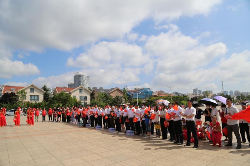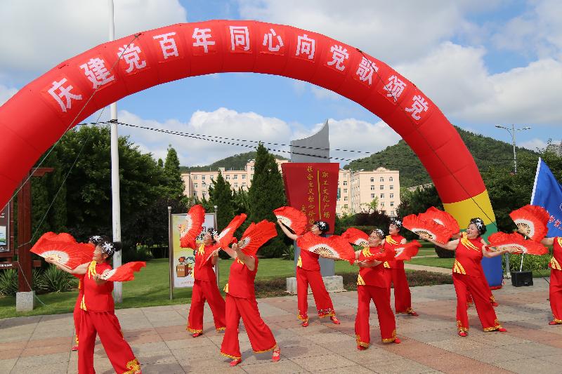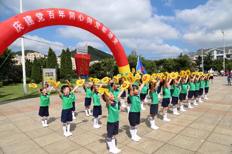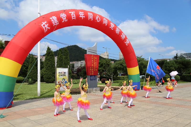 7 月4日上午9点许的大连市黑石礁地质公园广场,碧海白滩,丽日晴空,舞乐声声,由市群团组织综合服务中心所属市希望工程办公室、沙河口区关工委、沙河口区文明委、共青团沙河口委员会、沙河口区黑石礁街道指导,大连市希望工程李光祥志愿大队主办,庆建党百年 同心向党 歌颂党露天文艺演出专场在这里隆重举行。翩翩起舞活跃的社区文艺表演舞蹈团队,一支支天真可爱表演精彩的幼儿园小宝贝们,在长达1个多小时的演出专场上,奉献给围观市民行人如织的公园广场观众群众,一道丰富多彩丰盛献礼建党100周年的文化盛宴。