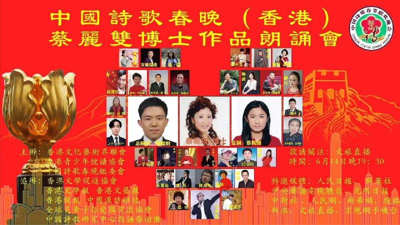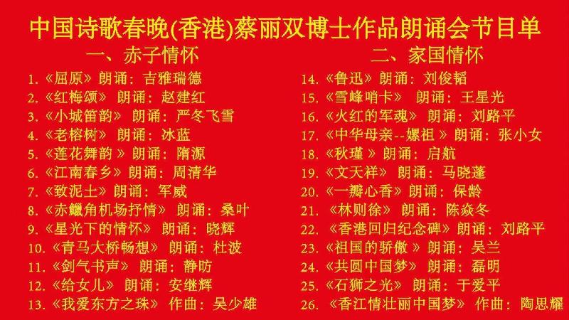 作者简介:蔡丽双,国家一级作家、文学博士、中国作家协会会员、中华诗词学会常务理事、香港文化艺术界联会主席、香港中华文化总会副会长兼执行监事长,已出版获第二届冰心散文奖的《星光下的情怀》、获中央军委批示到四大军区赠书的《鱼水情深》等九十多部个人专著,作品入编《大学语文》课本等,多次举办全球性的“蔡丽双杯”:《祖国情》《故乡情》《图书缘》《草原颂》《赤子情》《中国梦》《草原情》《家国情》的散文、散文诗、新诗、歌词和“清丽双臻”及“曼丽双辉”填词大奖赛等。