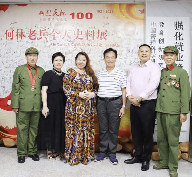 观展合影,左起:何林老兵、余芳蕗(主办方领导)、刘丽平(香港中华非物质文化遗产发展基金会副主席)、董乾启(原武警茂名支队政委)、薄钰阁(华夏军创广州军创总经理)、李相成(老兵)