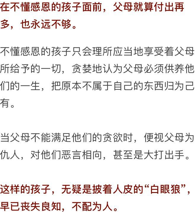 反之,不懂感恩的孩子将是一个家庭最大的悲哀,殃及自身,祸害九族。