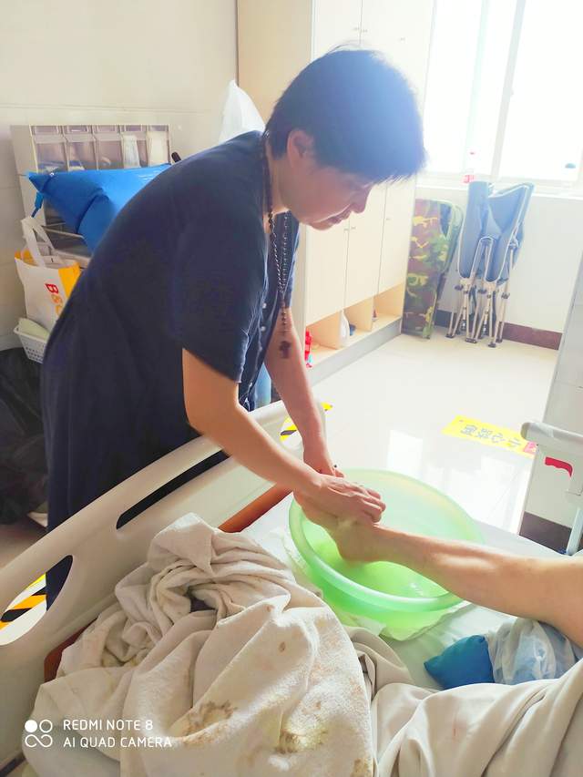 当晚爱妻主动陪护母亲,我回家安顿好下一代。接下来的23天,我做起了陪护工作。经初步诊断,母亲右股骨二处骨折,需要将伤腿吊床一周才能动手术。这一周显得格外漫长而煎熬,躺在床前的母亲只能一动不动地躺着,每翻身擦洗都会疼得死去活来,几乎彻夜不眠。到床即睡着的我夜里常常被惊醒,我多想好好睡一觉,但我时刻告诉自己不能偷懒,成功不能等,尽孝不能等。每次我会小心翼翼轻手轻脚从行军床上起来,用手把盖在老娘身上的被子往她身上紧一紧。透过走廊的灯光,看见母亲的脸上许多豆大的汗珠挨着两鬓。由于右腿股骨两处骨折无法动弹,只能向右侧一个姿势翻转,脚尖必须朝上,既不能活动又不能固定。
