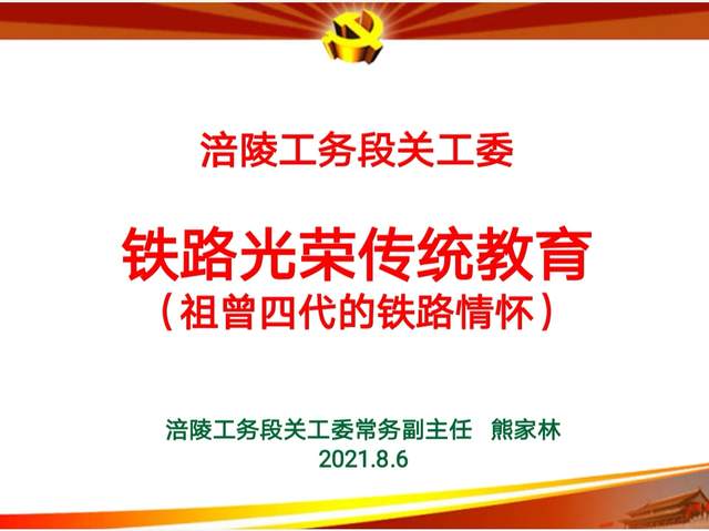 4.讲好一代代铁路人的精彩故事。通过讲述身边李老函《祖曾四代的铁路情缘》,把李老函祖曾四代铁路人艰苦奋斗的创业史,告诉新入路青工:养路工从上世纪点煤油灯巡道,面朝道床背朝天捣排镐的蒸汽机车年代,跨越发展到今天的现代化高铁年代,是因为有无数的铁路世家,像李老函祖曾四代铁路人那样,为铁路的跨越式发展,献了祖辈献父辈,献了父辈献子孙,献了子孙献终身,之所以才有今天享誉世界的“中国高铁”这张靓丽的名片,旨在于激励新入路青工不忘初心,传承铁路光荣传统,脚踏实地砥砺前行。