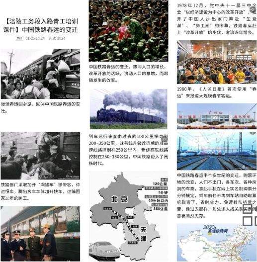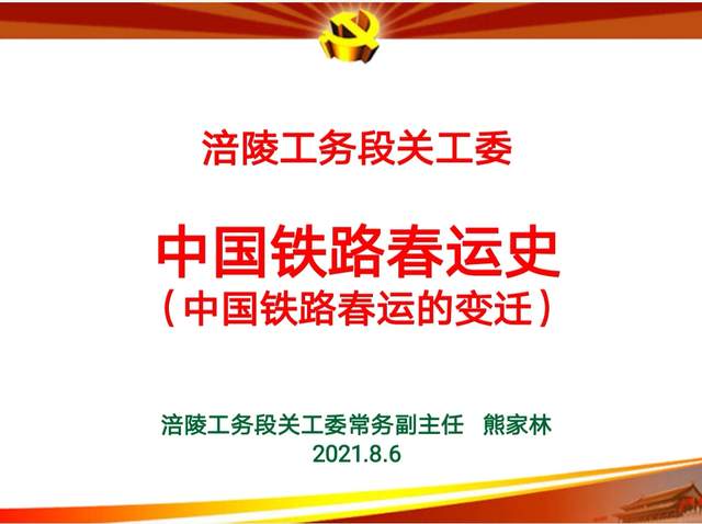 2.讲好《中国铁路春运史》。把过去由于运能运量的矛盾突出,导致旅客购票难,回家难,为买不到车票坐不上火车不能按时回家过年而犯愁。从1997年首次大提速开始,铁道部加快对既有线路升级改造和高速铁路、客运专线建设,历经8次大提速,八纵八横普高铁路网的形成,网络售票,电子客票,刷脸进站,省时省力,方便快捷,告诉一批批新入路青工,珍惜时光,能成为今天现代化铁路的员工而感到幸运。