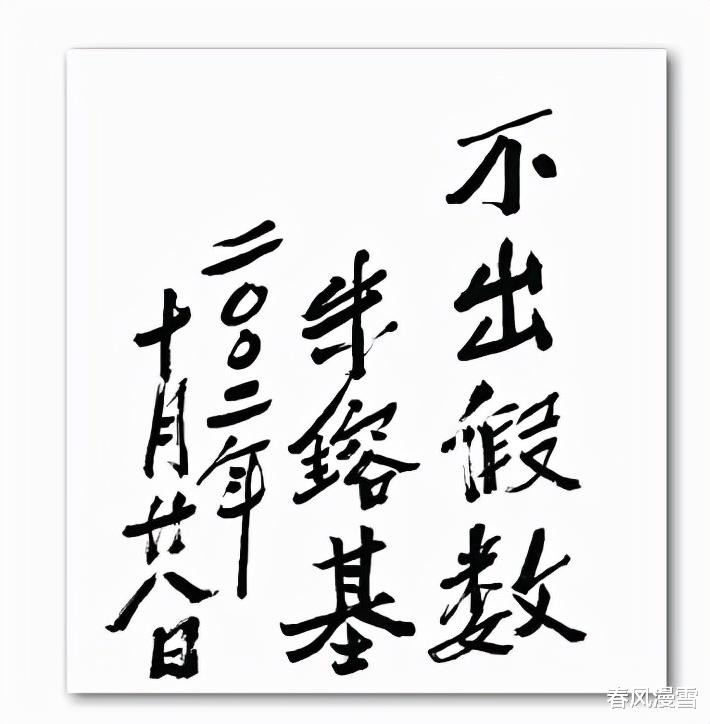 第三个字“假”字,前两笔出现了飞白现象,这是一种自然而为,可见,在书写上没有刻意之举,而且自然状态,后面的内容,粗细均匀,很有质感,最后一个字“数”,写得左右对比比较明显,分开的距离稍稍大了一些,充分展现了对比之势,不仅如此,两边形成一低一高的状态,既有斜势,又生动活泼,不死板,也许这就是他对书法的独到认识和见解,相信,不少朋友看到这样的题字作品,也会感到清新自然的,看起来写的非常随便,其实并非随意。