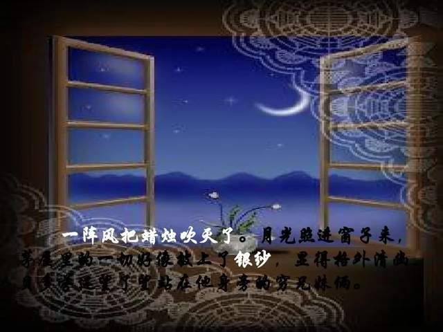 一阵风把蜡烛吹灭了。月光照进窗子,茅屋里的一切好像披上了银纱,显得格外清幽。贝多芬望了望站在他身旁的兄妹俩,借着清幽的月光,按起了琴键。